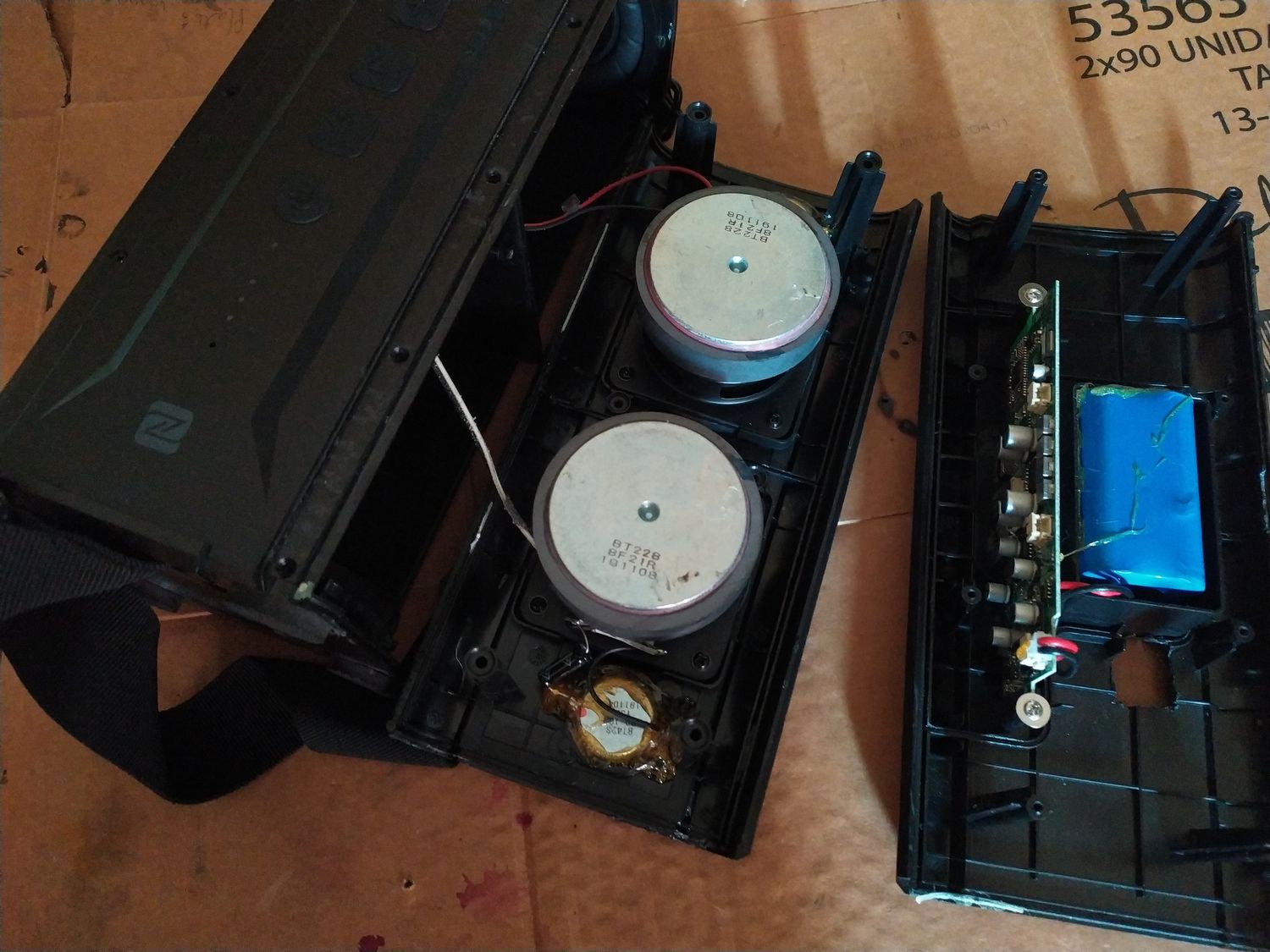 I have a W-King D8 Bluetooth boom box which I'd like to modify with some external speaker output jacks and some buttons to switch the internal speakers on and off.