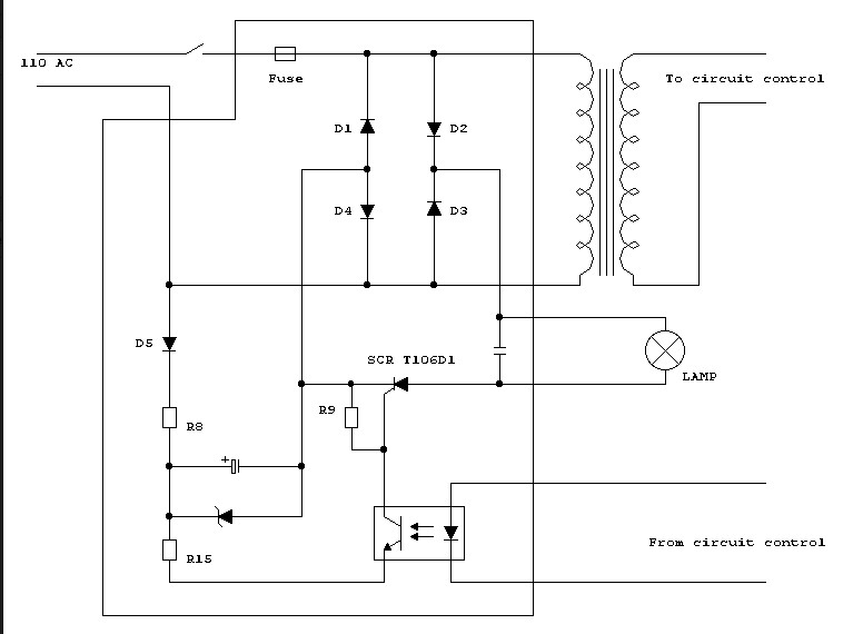 The attached schematic is from a version of the light that has the mains transformer built in and a SCR for the lamp control.