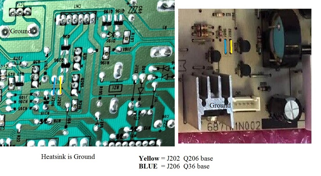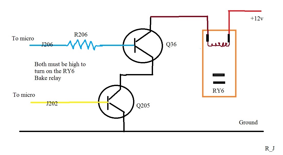 If you like you can check the logic that controls the two transistors, The main control board can be installed and you can access the two test points I marked in Blue J206 and Yellow J202. These two test points are the base of Q206 and Q36 which are directly controlled by the microprocessor ic (probe carefully) I would guess a voltage of between 1~5v for a high.