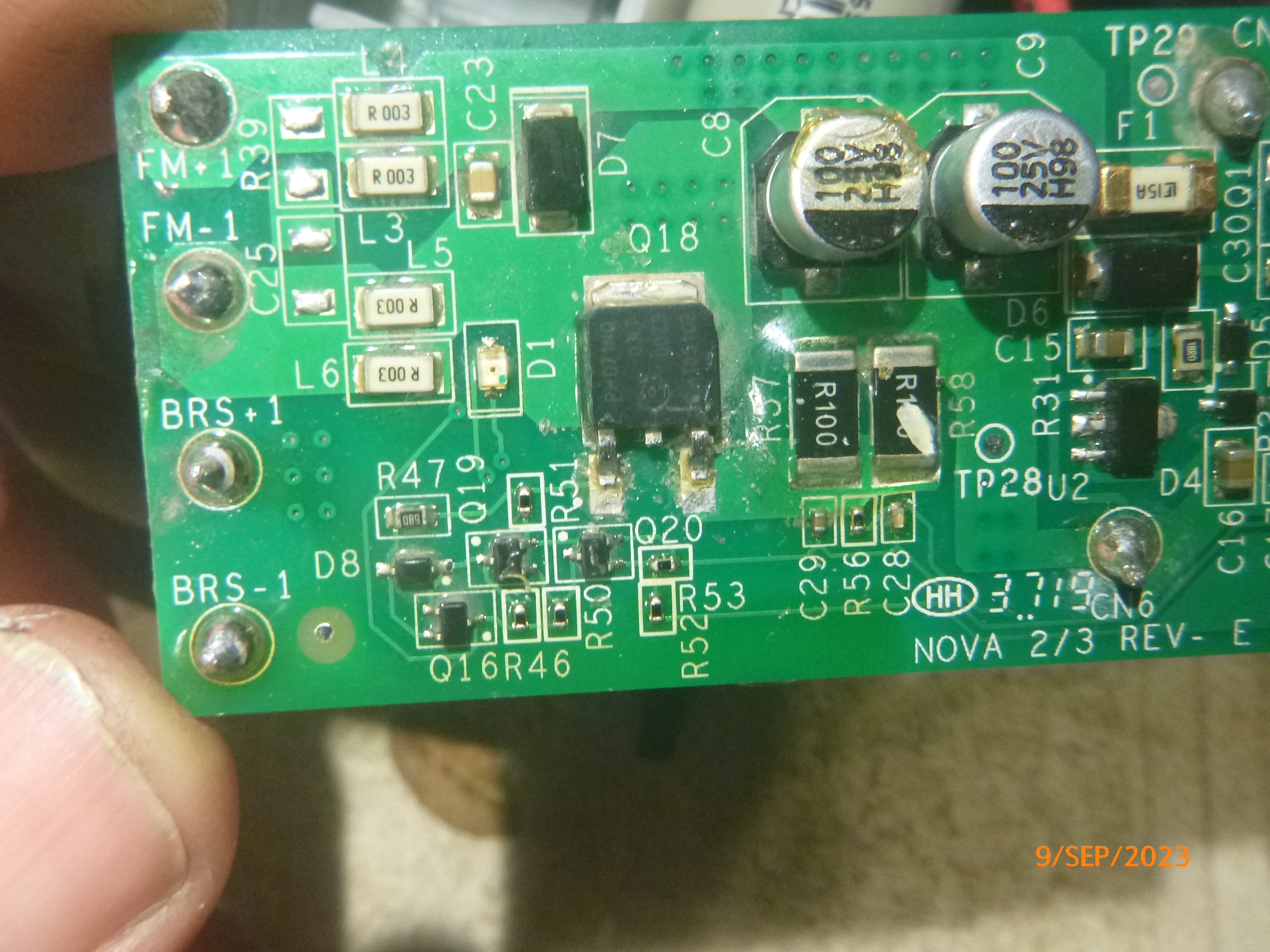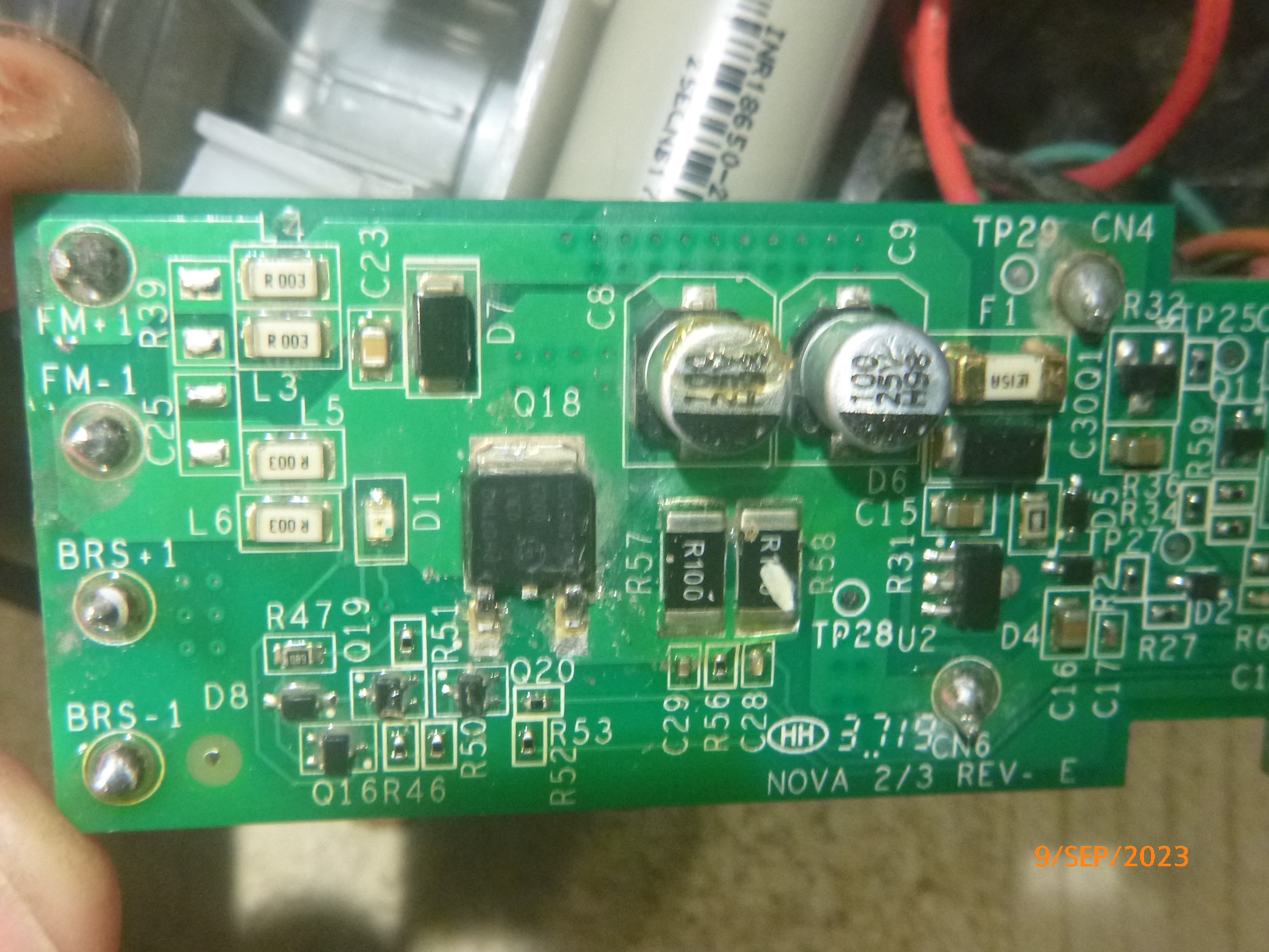 The motor works fine when voltage is applied to FM+1 & FM-1. The switching on and off is made in the negative line between CN6 and FM-1, and all components have been tested as fine apart from a FET.