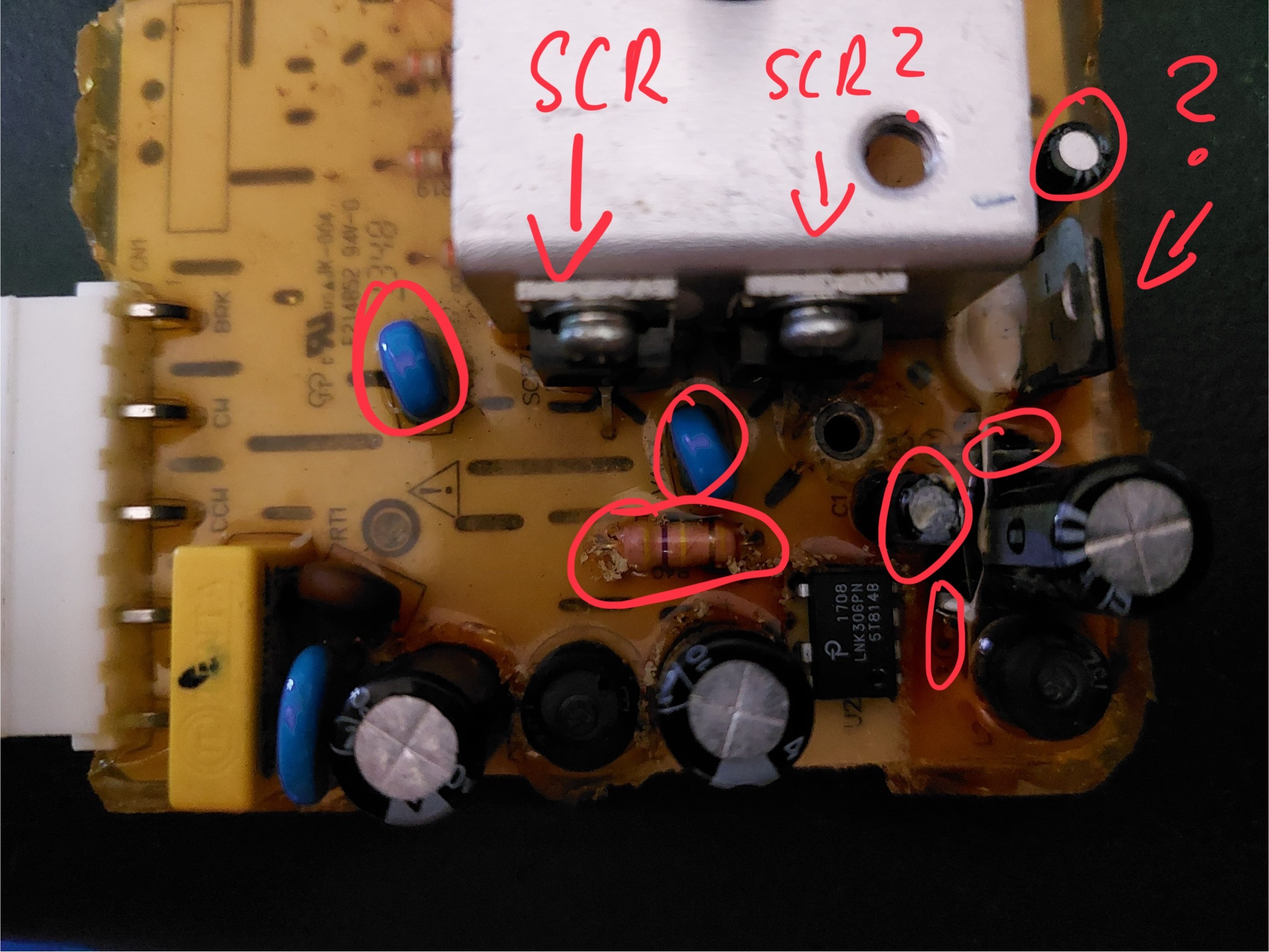 The rest of the parts appear fine (checked SCR's, the 5V regulator, diodes, the voltage switcher and resistor).