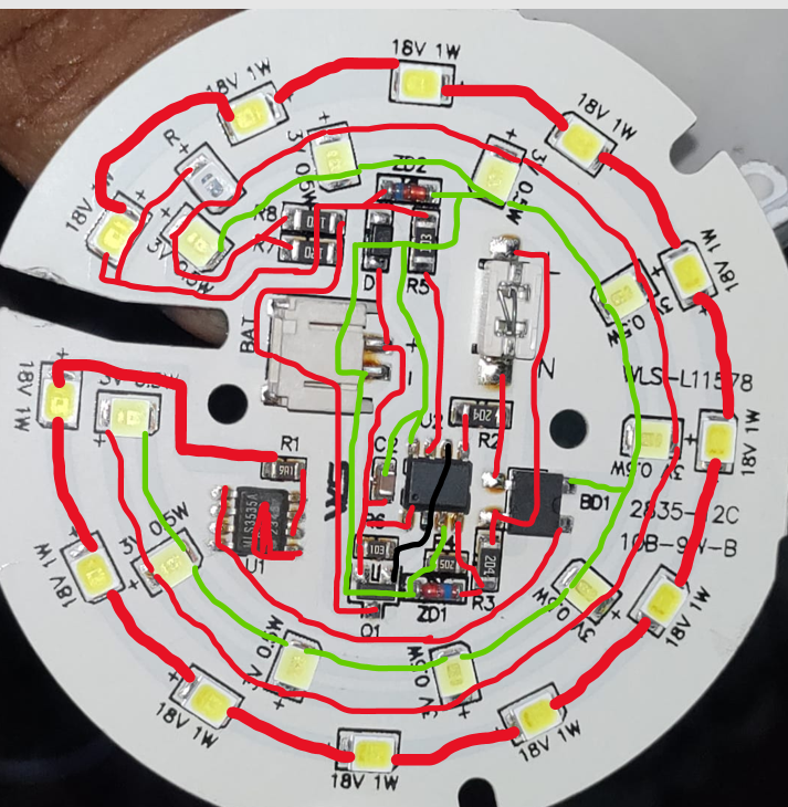 MLS3535A Mosfet (guess), A1sHB mosfet. 12 1W leds, 10 0.5W leds, bunch of resistors, one capacitor, 2 zener diodes