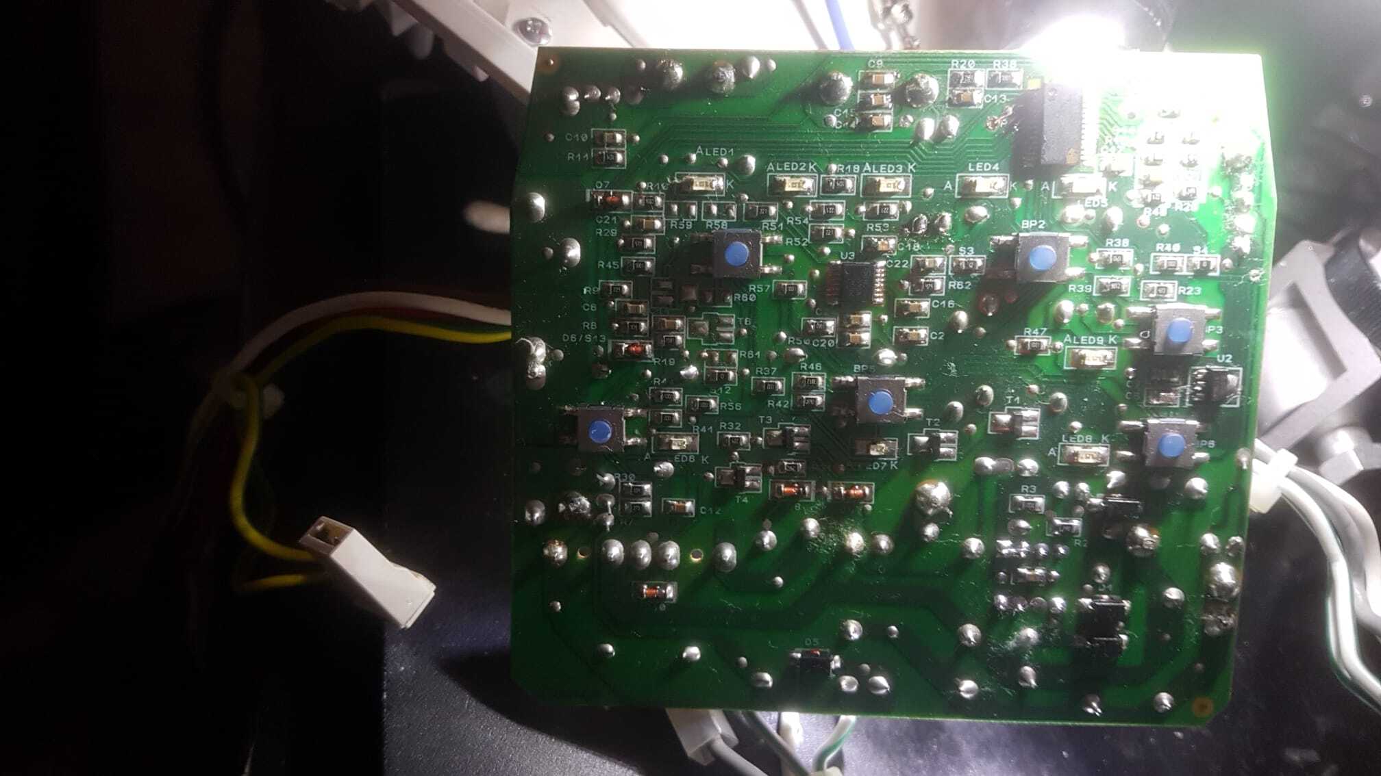 Dismantled and initial visual check on the power supply PCB - there is no fuse anywhere, and resistor is quite obviously burnt. Can't really read to color code, guessing it could be 100ohm (brown, black, brown, gold) or 180ohm (brown, grey, brown, gold).