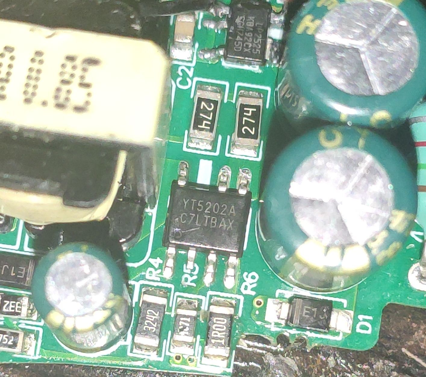 In diode mode, the LEDs all light up when probed so I'm guessing this means the LEDs themselves are OK. I was expecting to see burn marks around LEDs like I've seen with other bulbs that have died. I was also expecting it to be a simple cap issue - another smart bulb (different brand) that suddenly died just had a cap issue and was repaired by replacing just one cap. Unfortunately, it's none of these on this bulb from the looks of it. I see two ICs on this PCB - a BP2525 and a YT5202a. I suspect the issue must be with one or both of these ICs. Not sure which one yet. I can find a datasheet for BP2525 to get an idea of the pinouts. I can't seem to find any data for the YT5202a IC. Does anyone perhaps know about this IC or maybe an alternative that's close to it? I've attached an image of the YT5202a IC.