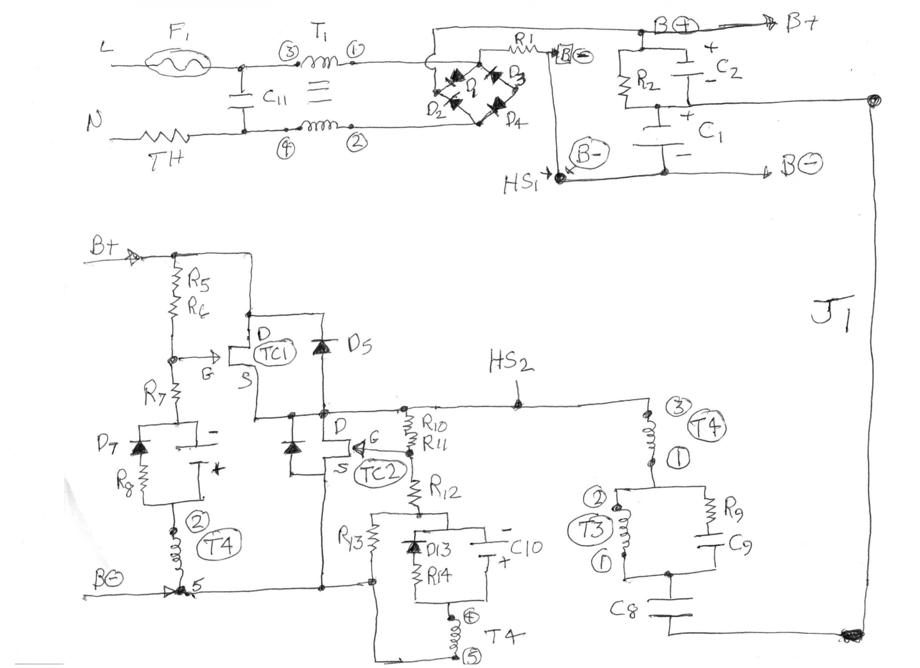 acornish I believe if you measure across the large caps that are connected to the diodes you should read around 108 Volts DC.The Capacitors are in parallel so it does not matter which you measure just observe the polarity of the capacitors the - is negative. If this voltage is not present then I would say something is wrong with the front end of the circuit.