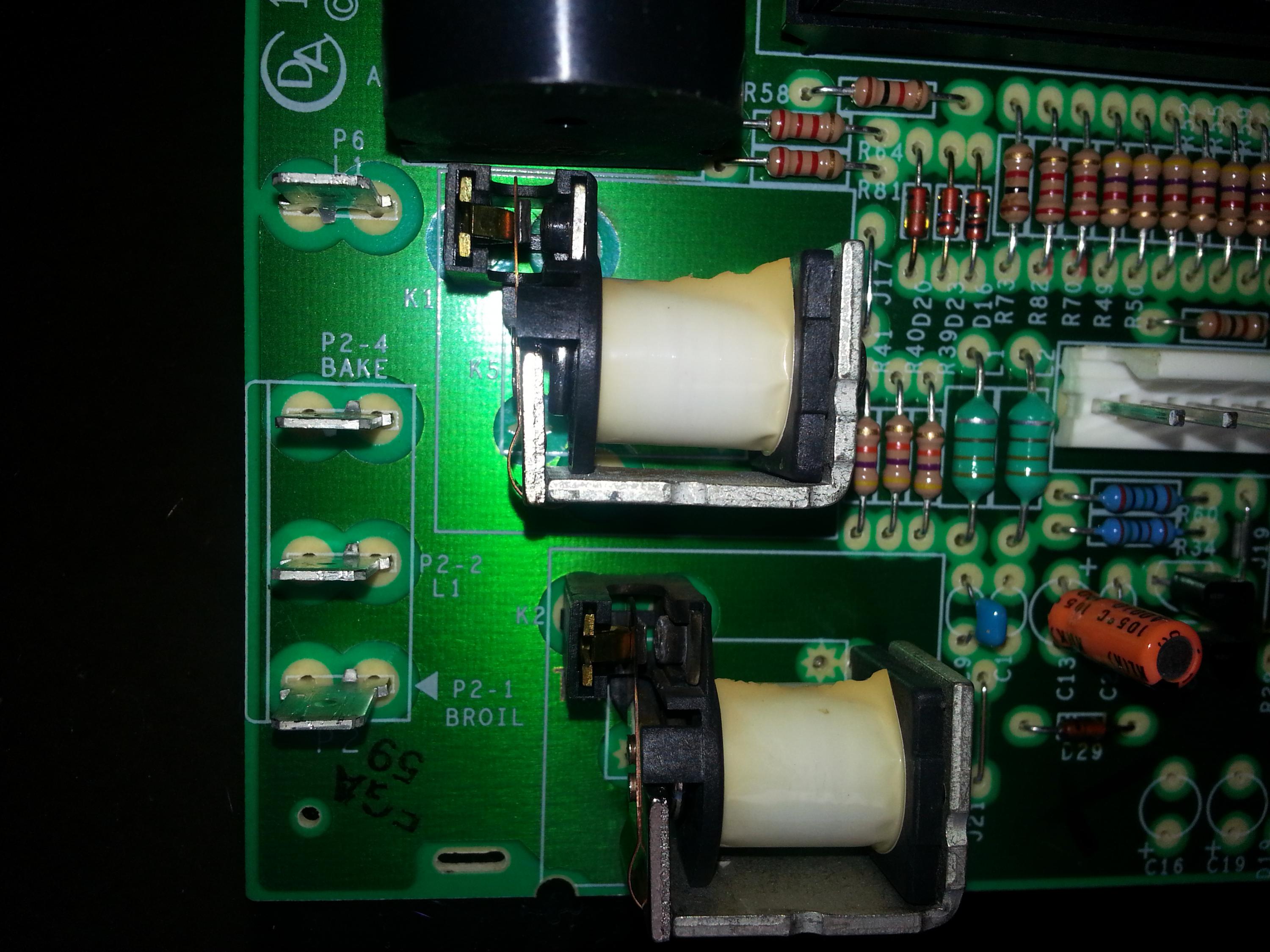 I concur with longbow. I repair more kitchen equipment than I'd like to, and relay/contactor failure is fairly common in ovens. I'd replace all the caps too while I was at it just because I had the board out.