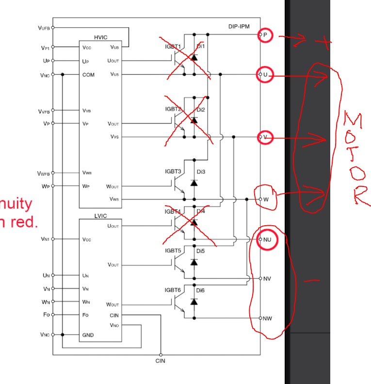 Your module is faulty, it has three phases for powering the motor and two of its phases are broken, there is a short circuit on three IGBT transistors.
