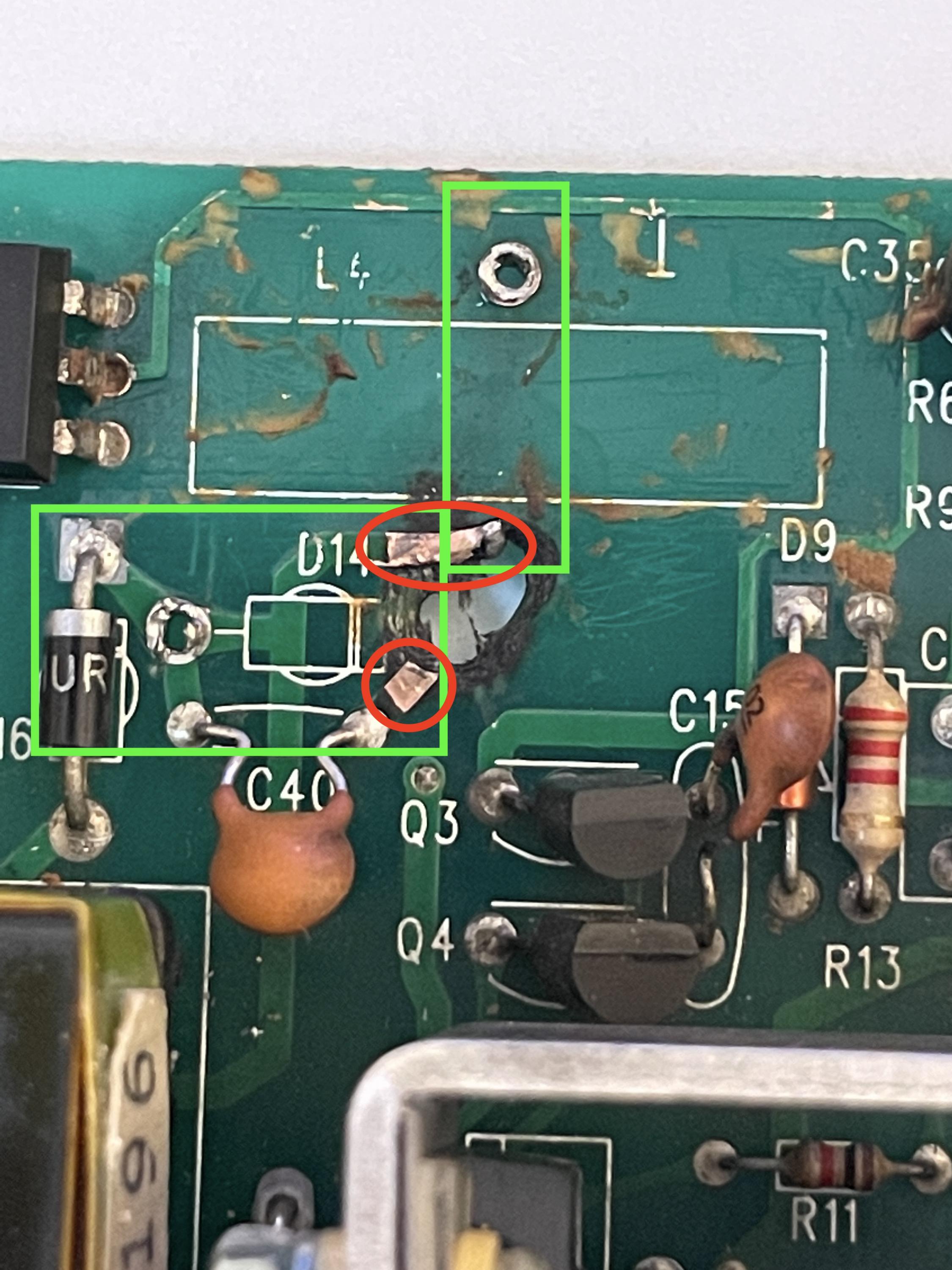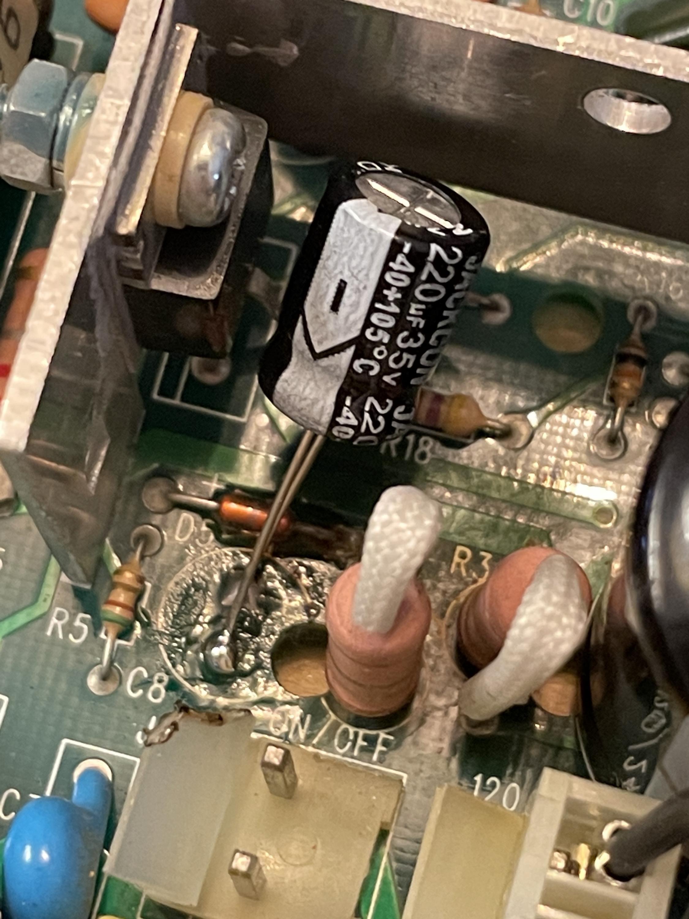 Also, in the section with C8 that I've already taken out, C6 is rounded/puffy at the top while C7 is flat. The guy at the pro audio place said he'd replace both of those as well. Both of those have the yellow (now brown) glue on them as well.