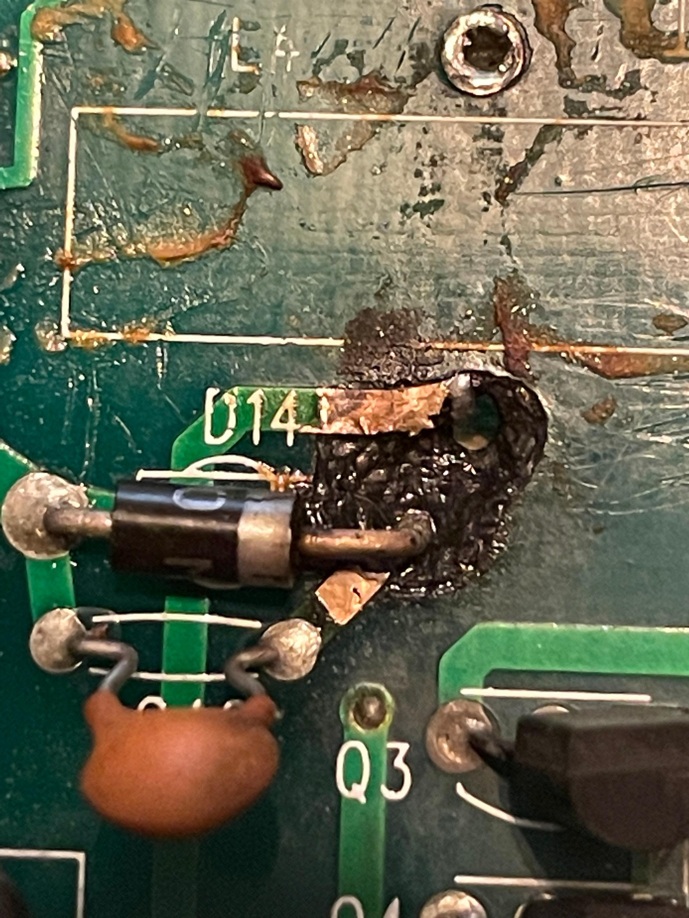 Also, in the section with C8 that I've already taken out, C6 is rounded/puffy at the top while C7 is flat. The guy at the pro audio place said he'd replace both of those as well. Both of those have the yellow (now brown) glue on them as well.