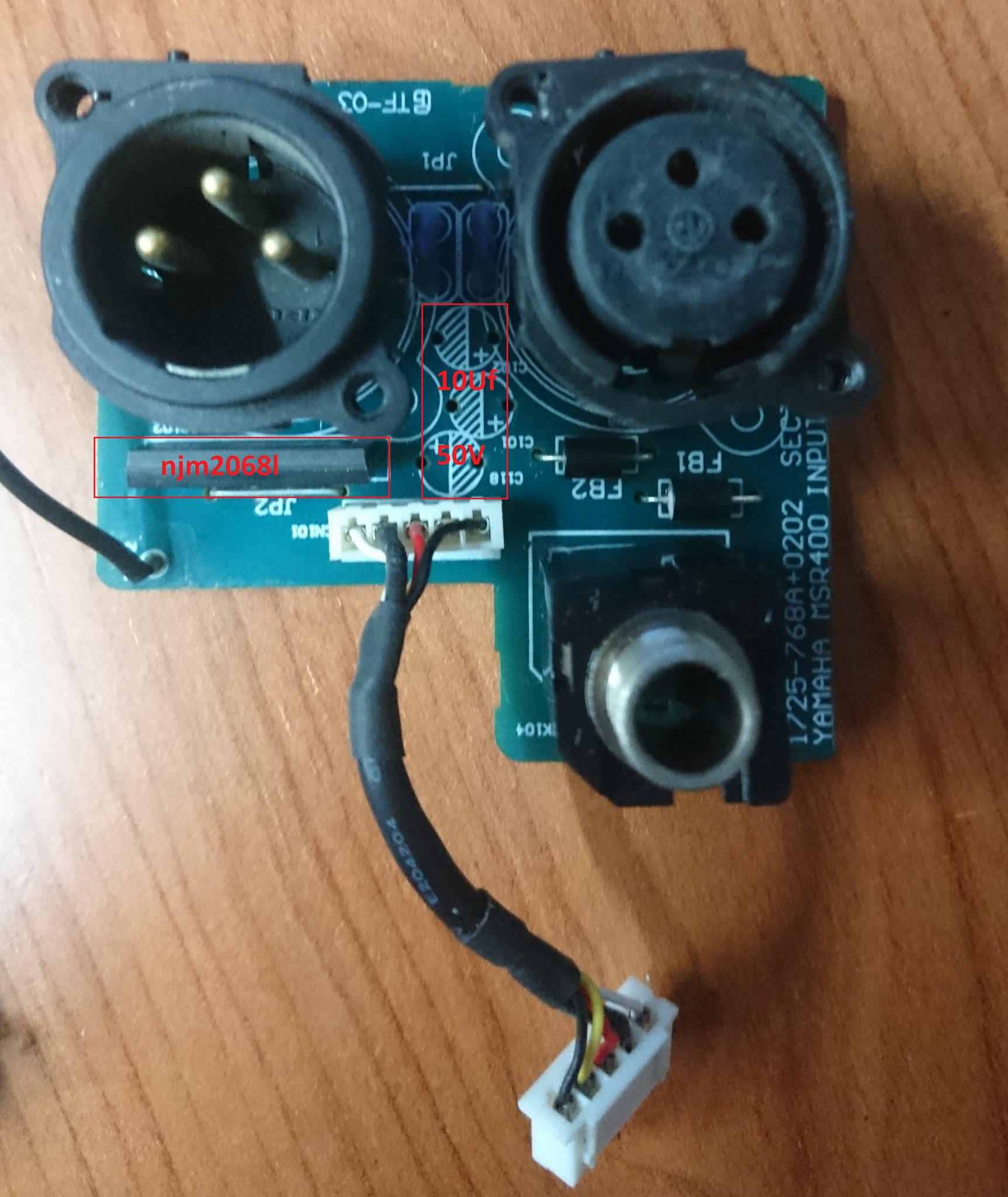 I have a problem with this input module of an active speaker of the Yamaha (MSR400), the signal transmitted by this unit and sent after the EQ module and then end up the amplification form is lower than normal, I attribute the problem to this Module because with that of the twin box works perfectly, I thought of the three capacitors highlighted in the photos and that I have not yet replaced or the operational highlighted NJM2860L, the strange thing I noticed that by trying with the jack by pulling it a little out of the normal position the earnings is normal, while when everything is inserted you don't have any signal, but the jack contacts are perfect, instead with the xlr as I said it is very low thanks for those who can help me