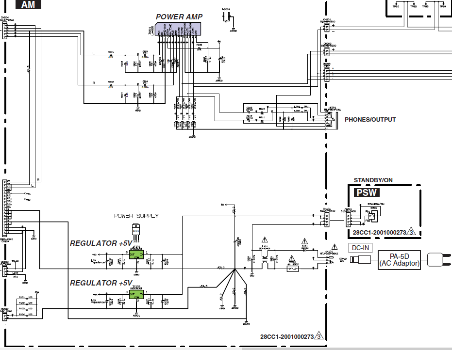 I have this keyboard that I am working on that doesn't power on when connected to voltage. Upon looking at the schematics I believe that the issue is with the power supply circuitry (schematic screenshot and pdf attached). I have poked around the circuit from the DC in jack and for some reason, the two 5v regulators only seem to get around 0.5v in and 0v out. I have tried jumping the power connector to simulate the on switch, but no dice and I get the same readings on the regulators. The fuse is fine and will beep in diode mode. Nothing looks obviously bad or scorched.