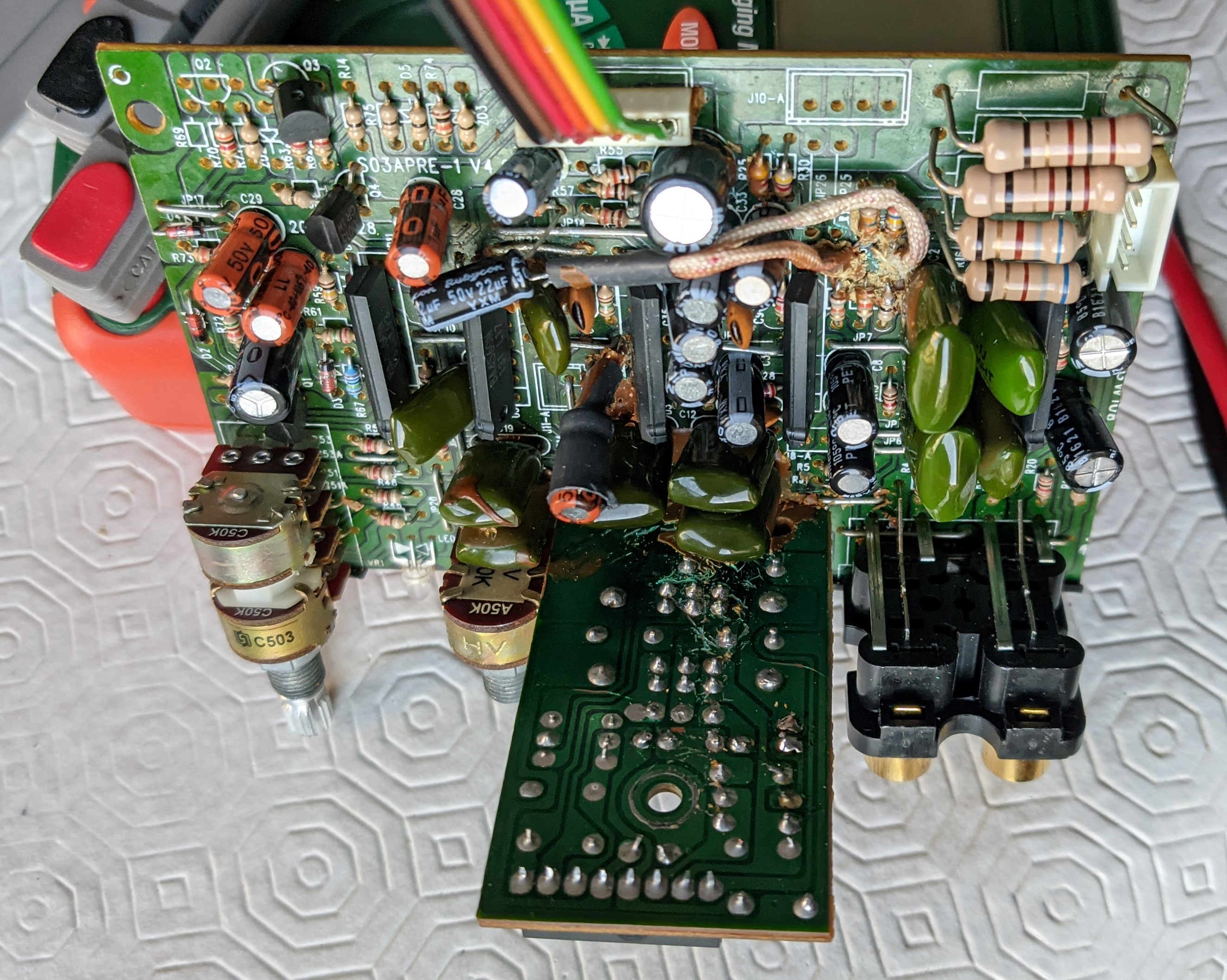 After reading some subwoofer "no sound" threads, I replaced all the electrolyte capacitors on the signal input board and noticed most of the 22uF 50v capacitors were bad. That did not solve the no-sound issue.