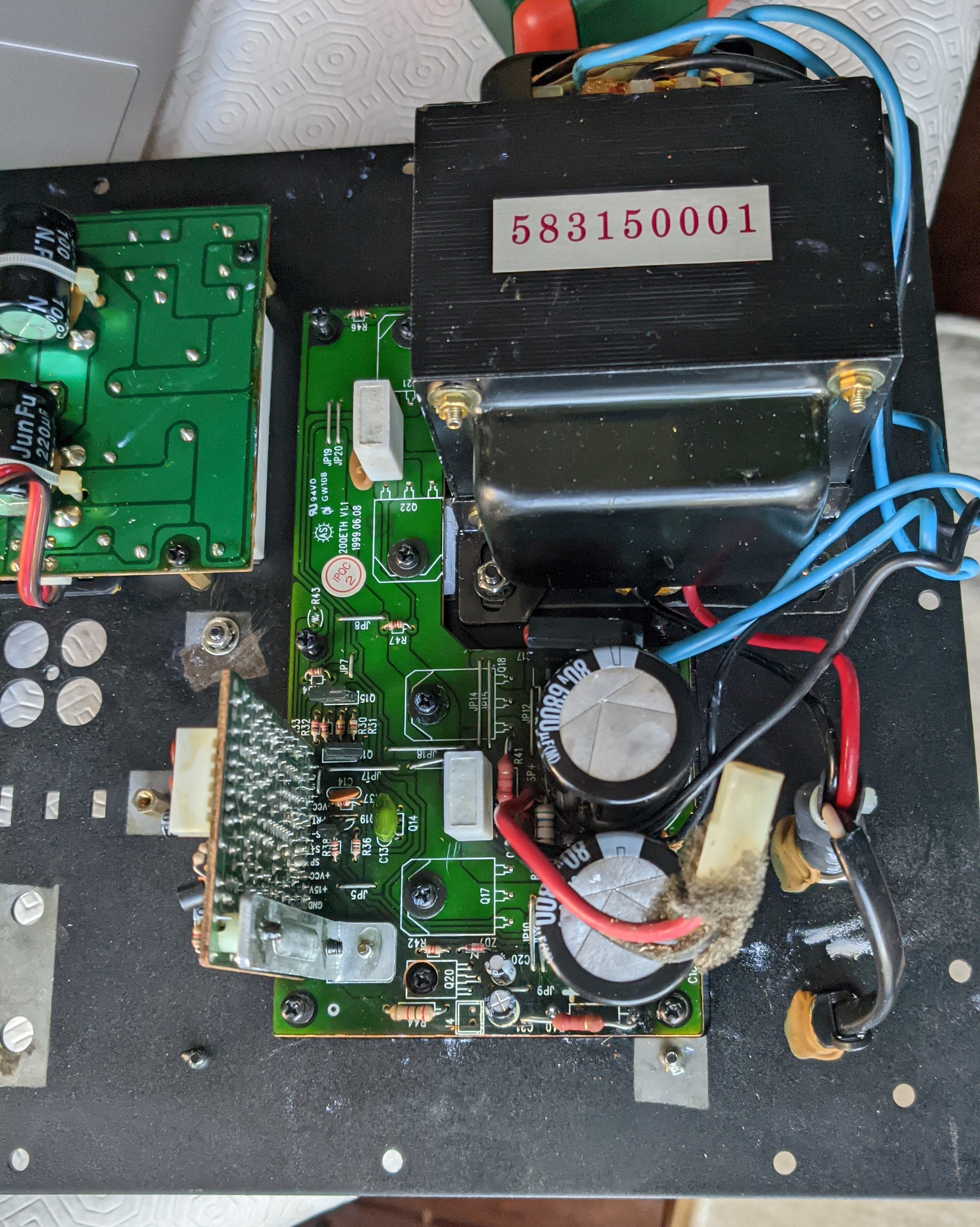 Unit was working then one day no sound with the unit humming when the power switch is in the off position. When I move the switch to the Auto or ON position, nothing happens, the humming stops but no sign of life (power LED was off). I opened the amplifier and noticed one of the main power 6800uF capacitors was bulging. I replaced both 6800uF capacitors and also replace the large resistors (R41 and R140) since they looked burned. The humming when power switch is in the off position was still present but the unit will power on now. Tried connecting signal to it but then no sound. When I move the power switch from the off position to the Auto or ON position and vice versa, there is a loud pop sound. The pop sound also occurs when I move the phase switch or the Audio/video switch