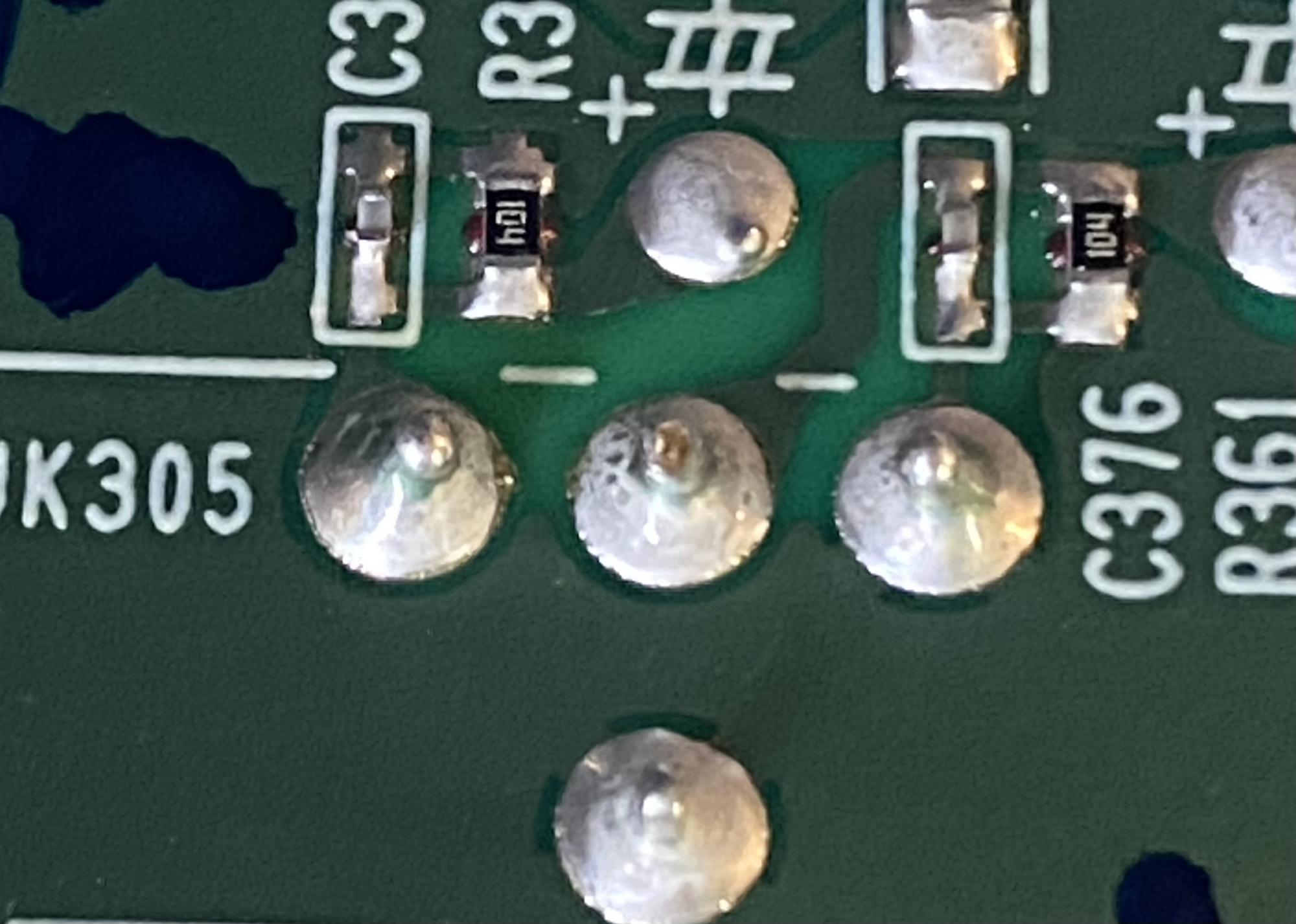 I have pulled the output board. Output txsistors are ok (only 2 main output). Everything measures the same on each side. Customer did not bring in speakers so I cannot go too deep. I did notice a greenish tint on the tip of the solder joints that connect to the COPPER output connectors. All 6 have a greenish tint at the tip - each side has 3 pins each. Anyone else have copper speaker output pins that corrode at the place on the PCB where they are soldered? I will try to add a photo. Thanks.