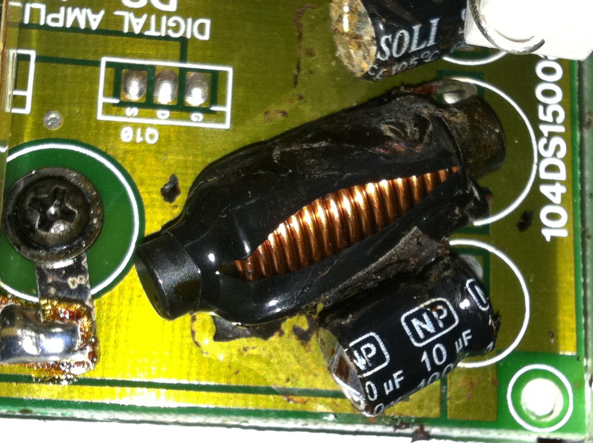 Found this cool site while looking for some answers on my sub. Started off intermittent, switching it on and after a minute of thumpage, going into standby. Now when I switch it on, it is trying to turn on but it cycles back into standby, continually. I took it apart and damage wise it looks to be this. Apparently it overheated and melted the coating, but am somewhat newbage and am unable to figure out what the specs are to this, resistor?