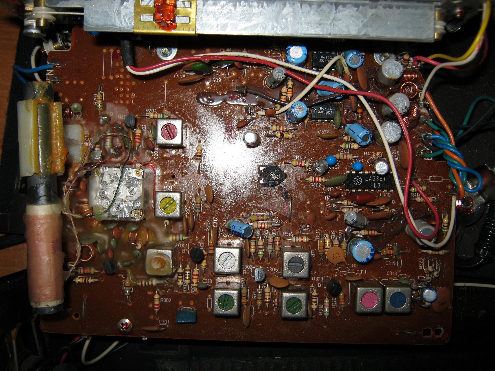 As the title says, the left channel does not work in this clock radio. When adjusting the volume, popping noises can be heard from the left channel. At all other times, the left channel is completely silent. Also, the right channel plays constantly and only becomes slightly quieter when the balance is turned all the way to the left. Inside, there are two TBA820M amplifier ICs. The left speaker works when connected to another amplifier.