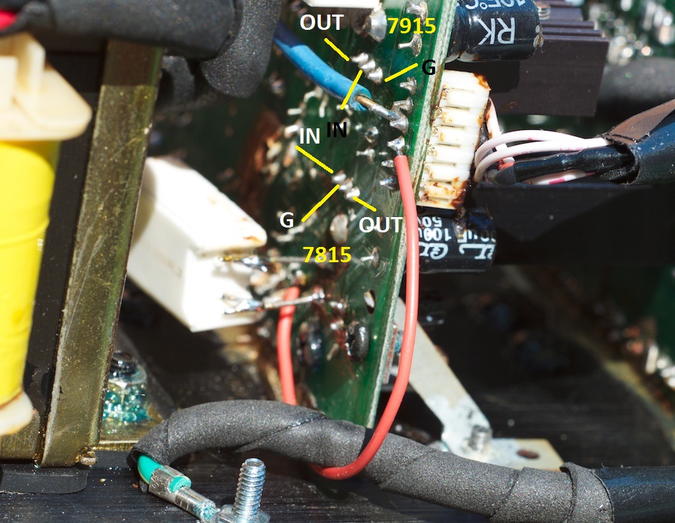 Ok, I've got the 7915 off. Not easy. The heat sink mounting pin and the three legs of the 7915 are tricky to de-solder and move. The track that runs from the 7915's outlet hole to pin 2 of connector 1 was already damaged/lifted. To re-establish the connectivity that would have run through that outlet hole, to connect pin 2 of connector 1 to the negative terminal of what is cap 12 on the 6D schematic, I've soldered in a jumper wire between those locations. Are you happy with this? I believe they should be connected for the intended tests.