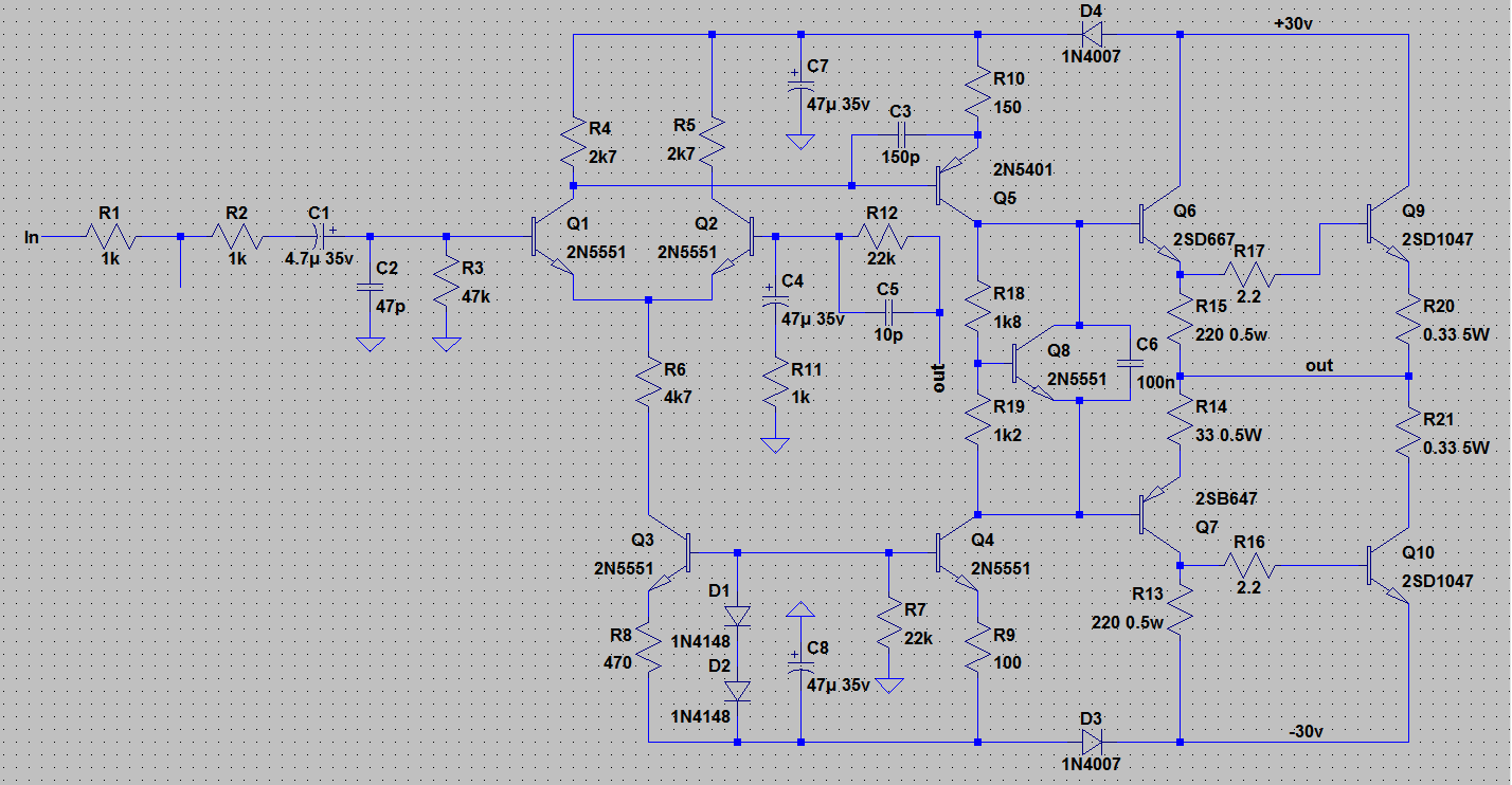 Output transistors are 2SD1047. Which would be enough for the job, but that heatsink is really flimsy. If the fan seizes they will most definitely go boom as there is no thermal protection. The drivers are 2SD667/2SB647, and the small signal transistors are 2N5401/2N5551. When delivering 60W on one channel the rails sag from +/-30v to +/-26v which is pretty poor performance.