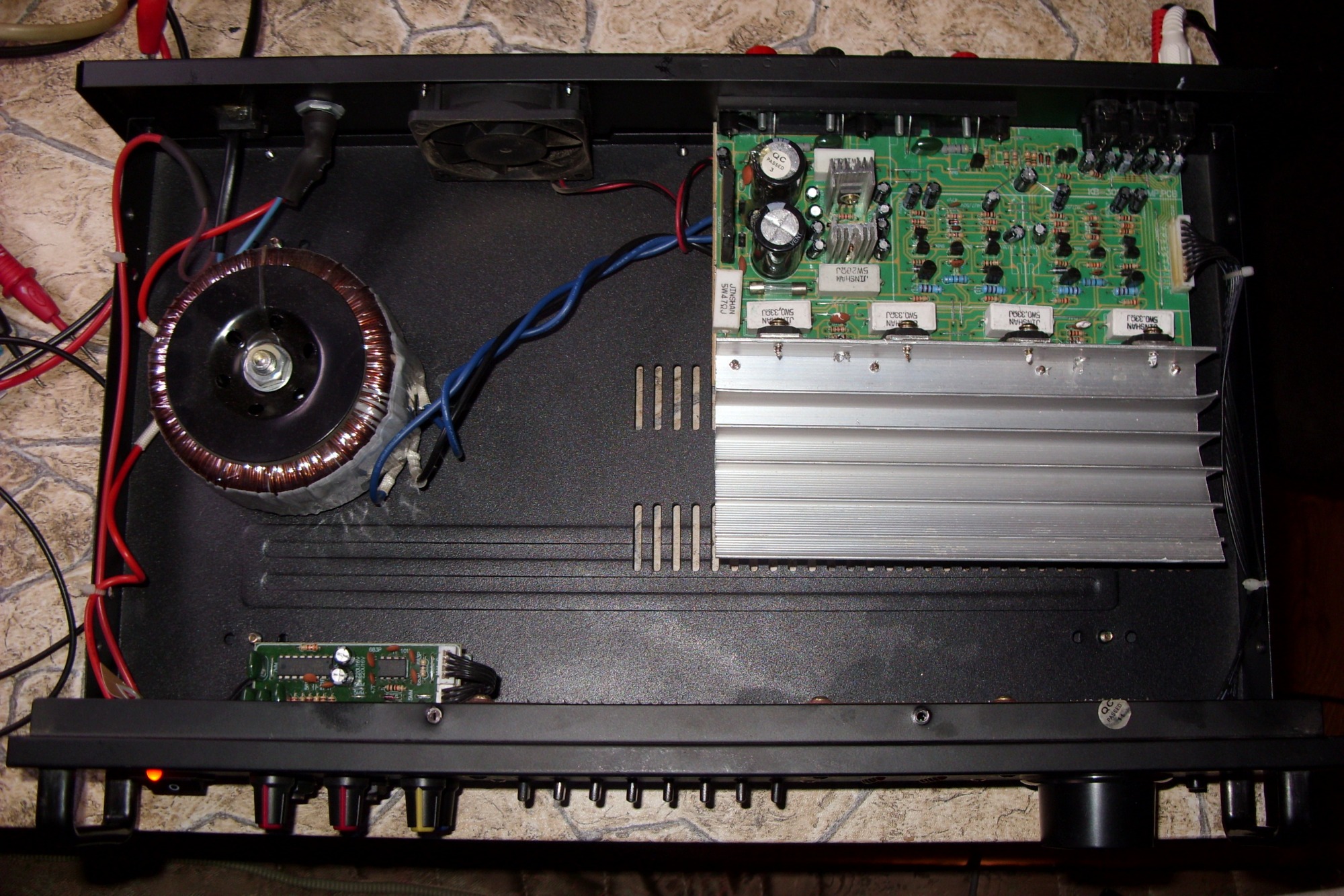 Just look at this thing. Tiny transformer, tiny heatsink, and a tiny fan (60mm) making not so tiny noise. Actually, the fan noise is pretty much on par with the volume of the music coming out of the amp... and the fan runs maxed all the time. That is, unless the amp is turned up loud, when the fan will slow down because the transformer voltage drops significantly. So, we have a fan that runs fast when you don't need it. Brilliant! Main filter caps are one taller than the other. On both of them it says 4700u 35v though. Which btw is not only too little capacitance, but also with the crap regulation of this transformer they will blow on high line if the amp is left idle.