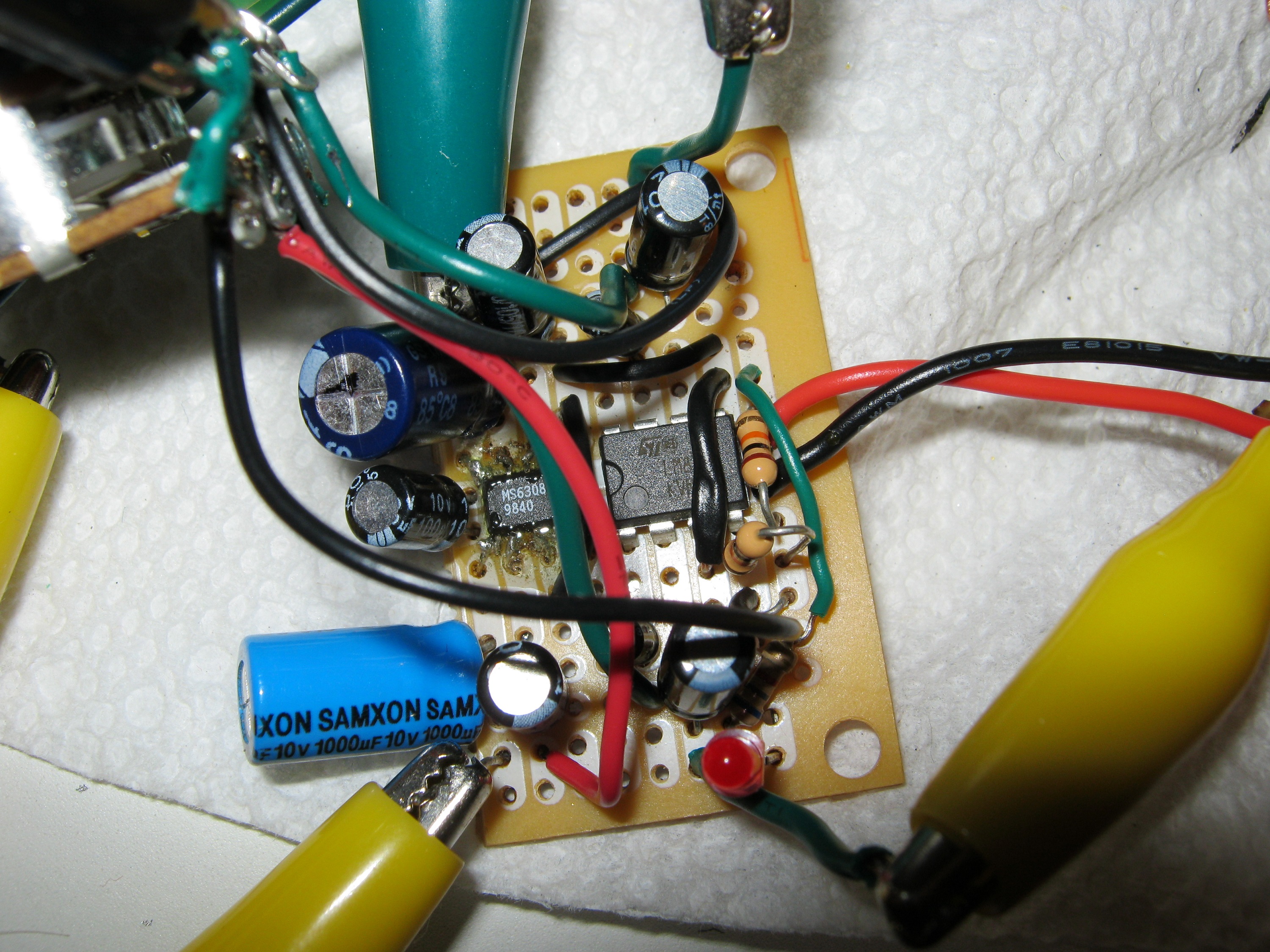I finished the MS6308 amp today. I just need to get some more audio jacks. I'm using a 78L05 with a diode in series with the ground pin to supply 5.6V to the amp. That isn't very good for battery power, but that was what I had. A 9V battery is nearly dead anyway when its output voltage gets low enough for the regulator to drop out.