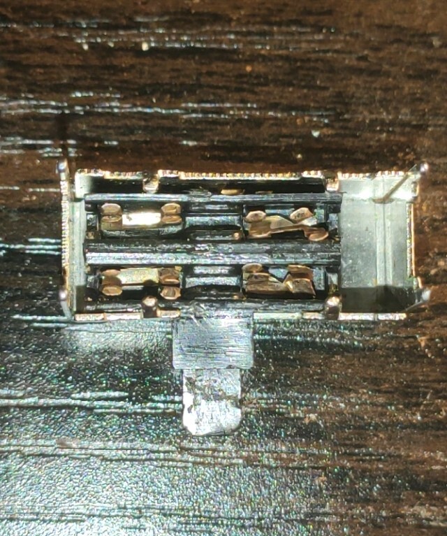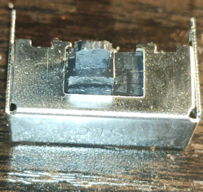 The switch appears to be broken on the inside causing a poor connection. I tried cleaning it up a bit with some 99% IPA, but it did not work. I ended up de-soldering the switch to try and take a look inside. I got it open and could see there is damage. Some metal pieces that come into contact with the pins on the mini board look damaged.