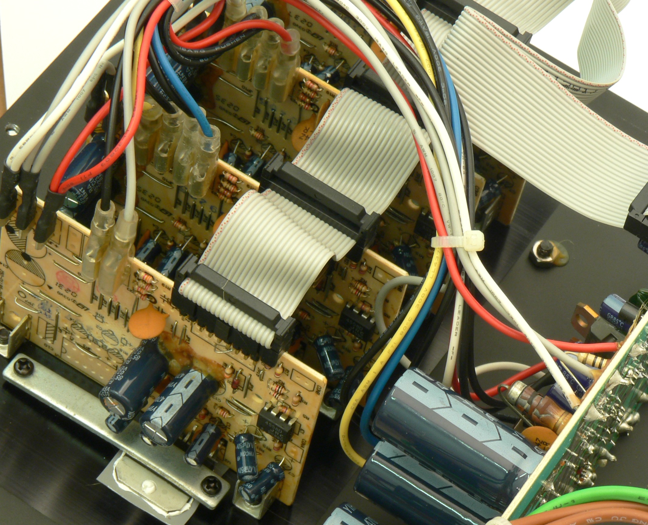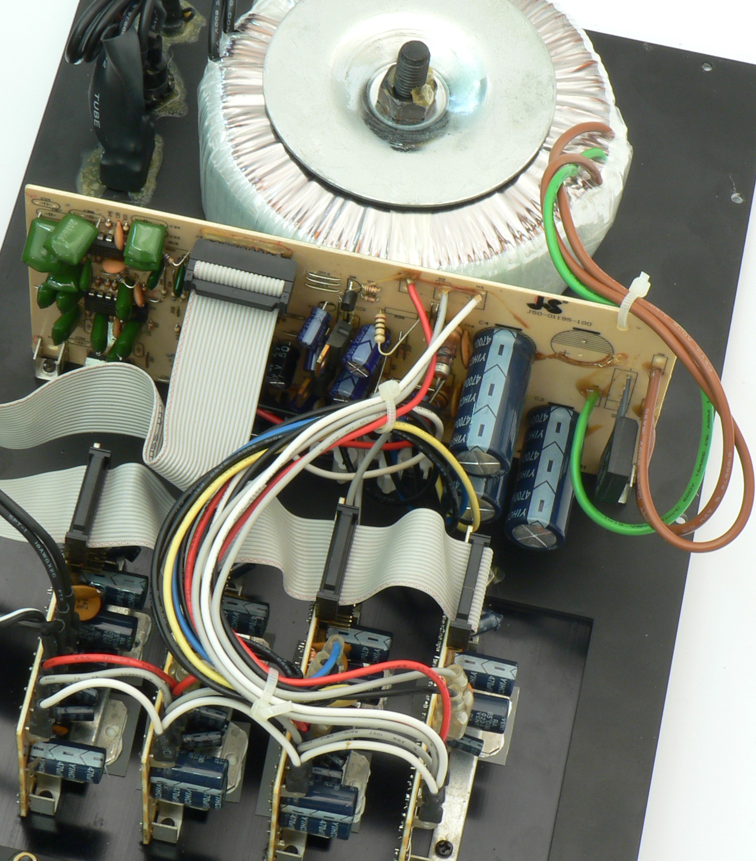 I scoped quite high saw-teeth like waves of several tens of mV ripple on both + and - rail, combined it is closing to 100 mV. Closing hand between transformer and amplifiers makes it worse but that's probably just it behaves like antenna.Capacity seems to be fine according to meter so the problem is not here. I noticed burned resistors, probably some low value but they do not measure anything in circuit, possible opened. From the remaints it does not make any sense, it seems to be black/black/brown (or carbonized red)/gold which does not seem to be anything according to calculators as black is 0. Can the resistors cut the spikes, helping to smooth the voltage?