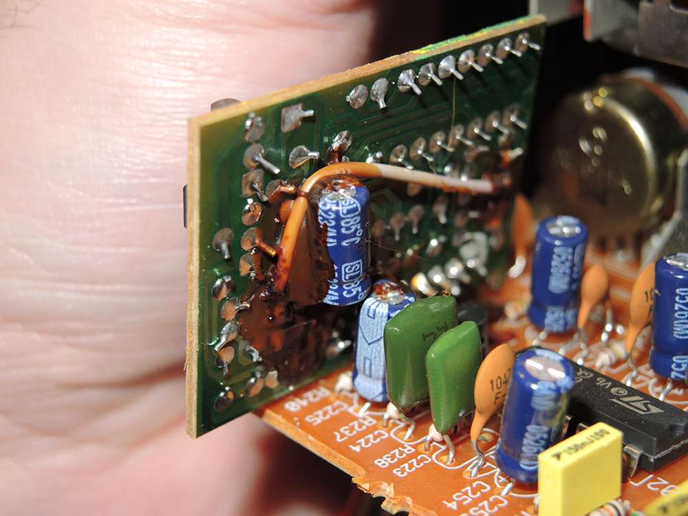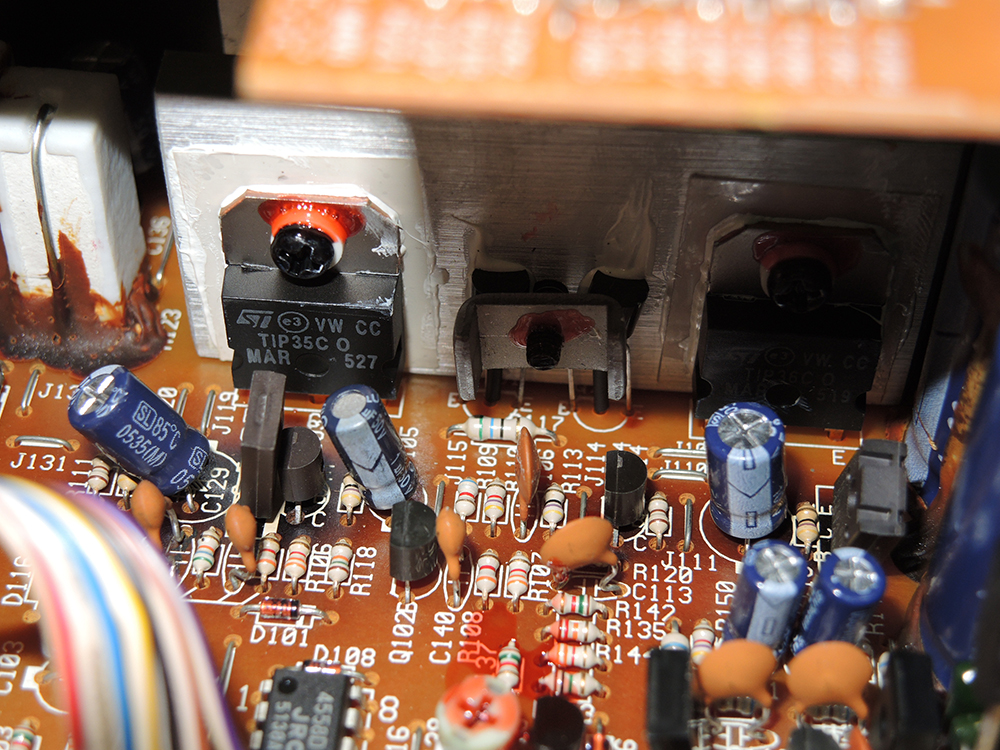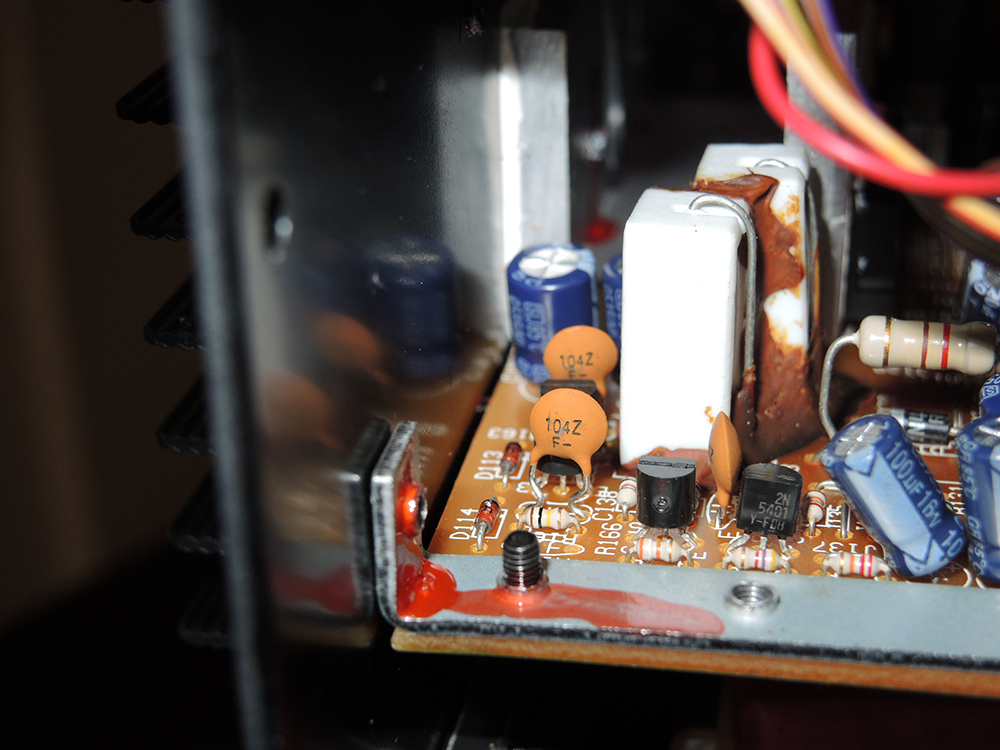 The issue I am having is when the sub is switched on it make a thumping noise randomly every few seconds regardless of the mode (i.e. AUTO/ON, Reverse/Normal, Filter on or off) and also regardless of whether there is an audio source connected or not. When it thumps the light will switch to ON (blue) when back to standby (amber). I know these amps have issues with bad caps so have disassembled the sub and looked it over but can't see any obviously bad caps. There is some darkening on the PCB but given its proximity to the heat sink I suspect this is pretty normal.