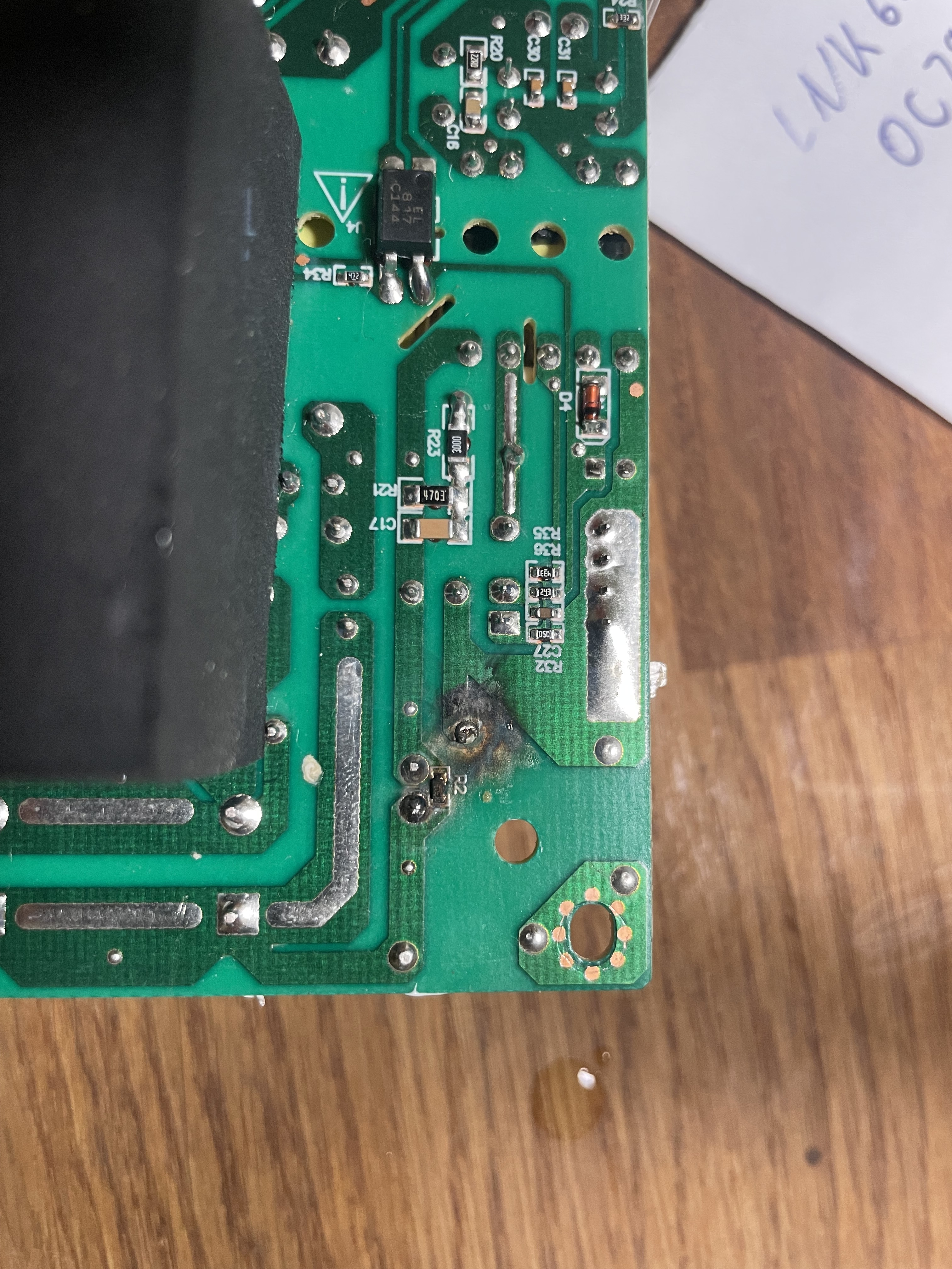I also attached a picture of the back side. The burnt part above R2 is a bridge, that is connected to the COM of two chunky electrolytic condensator (82 micro Farad, 400 V). I just tidied that up. Or should I worry about that?