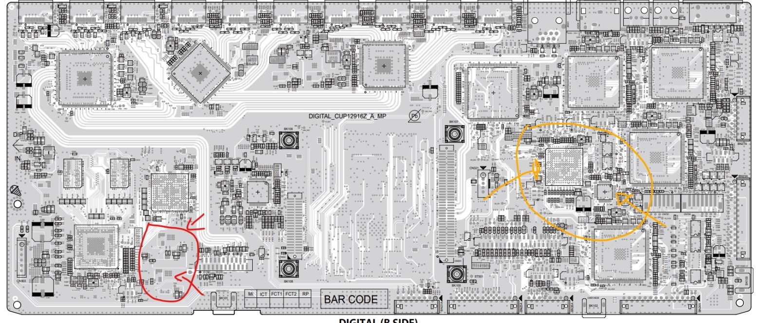 on the pic attached the red circle is where i measured the supply voltages. on the other side of the board there is 2 IC that are converting the 5.2V from the smps to 3.3 and 1.8. the orange circle is where the IC 221 is located.