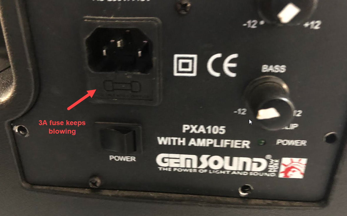 Have an audio amp (Gemsound PXA-105) that keeps blowing the 3A fuses upon power up. Owner stated that the amp was on when he plugged in the input (mixer board) and that started this chaos.