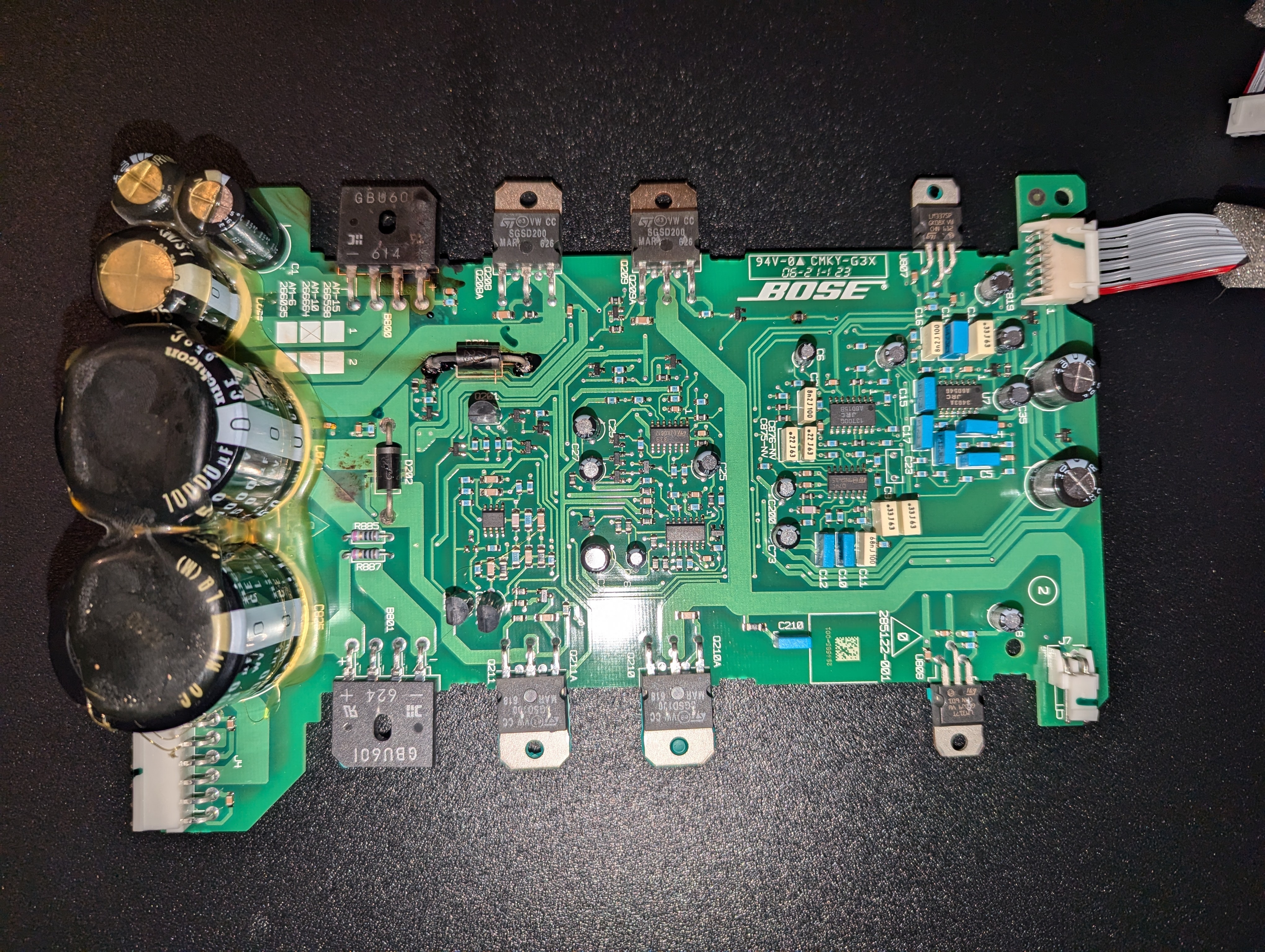 I picked up this used Bose Acoustimass 10 IV speaker system. Speakers seem to work fine, but the subwoofer does not make any noise. So I took apart the unit and found some obviously failed (burnt) components: