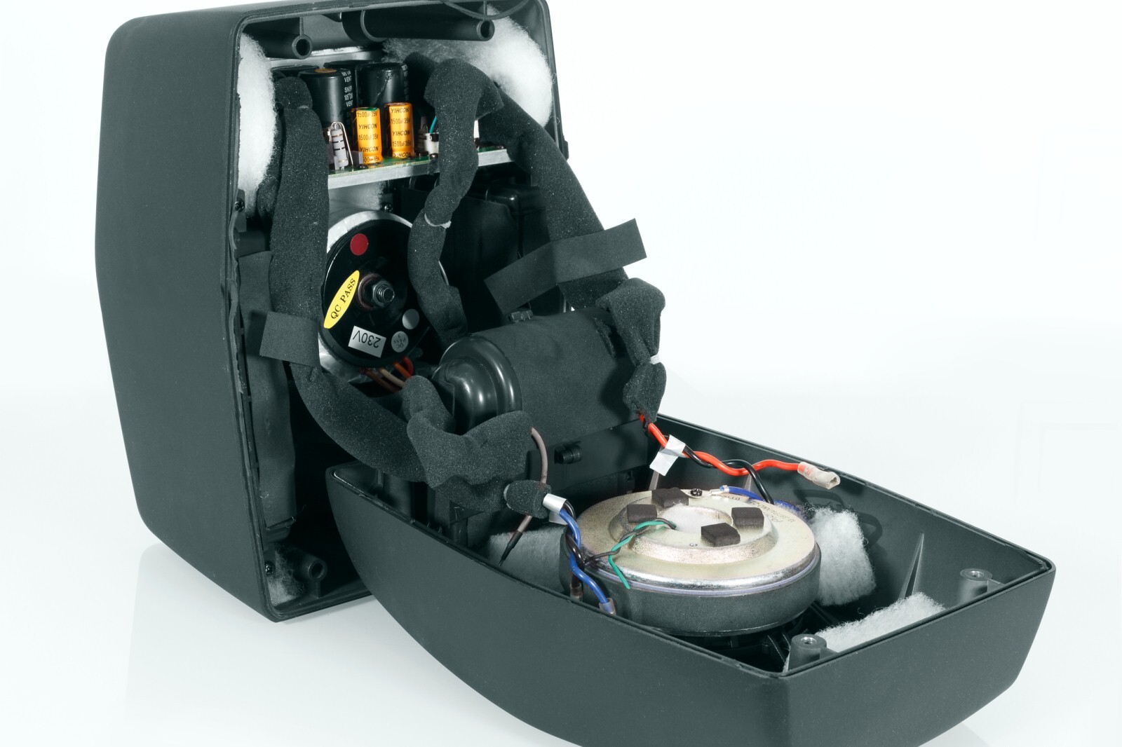 I have a pair of Pioneer RM-07 monitors that I bought a while ago. When I was testing them I noticed that one speaker would cut out and I thought it was just a bad cable connection. At the price they were being sold for I was willing to take a risk on them. However, 6 months later and the one monitor still has the same issue. Most of the time it works, but there are times that the power LED is on but I get absolutely no sound. I can hear the relay clicking on/off sometimes and then it will/won't work depending on what it feels like. I've tried XLR and RCA inputs with the same issue. There's no humming or buzzing, but it's making me think that a power capacitor is on its way out or there's a short somewhere? Like I said, the power LED stays on, there's no humming or buzzing, just no audio at all until the relay decides to spring into action. Due to how the speaker is designed it's tricky to open it without destroying the gasket, and I'd rather not do that because I'm not sure if I can source a new one or if that's even the problem. It's a Class A/B amp with a toroidal transformer if that affects anything. I have some pics of its smaller sibling the RM-05 which has a less powerful amp. I can easily access the EQ board on the rear and remove it, but I don't think that will gain me access to the caps in the power supply as you can see by the opened up pics.
