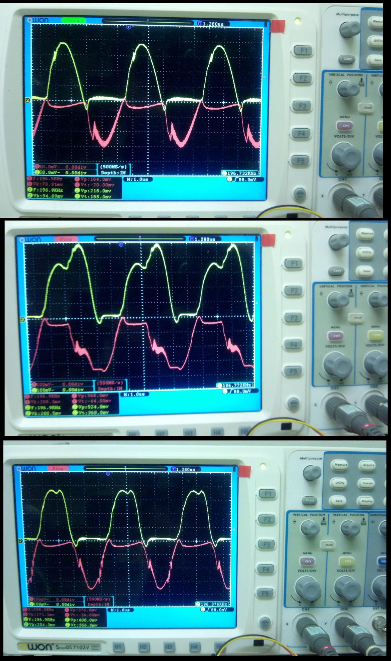 The first picture shows normal operation, load is around 2-2.5 Ohms. You can see the transistors opening and closing properly without overlaps.