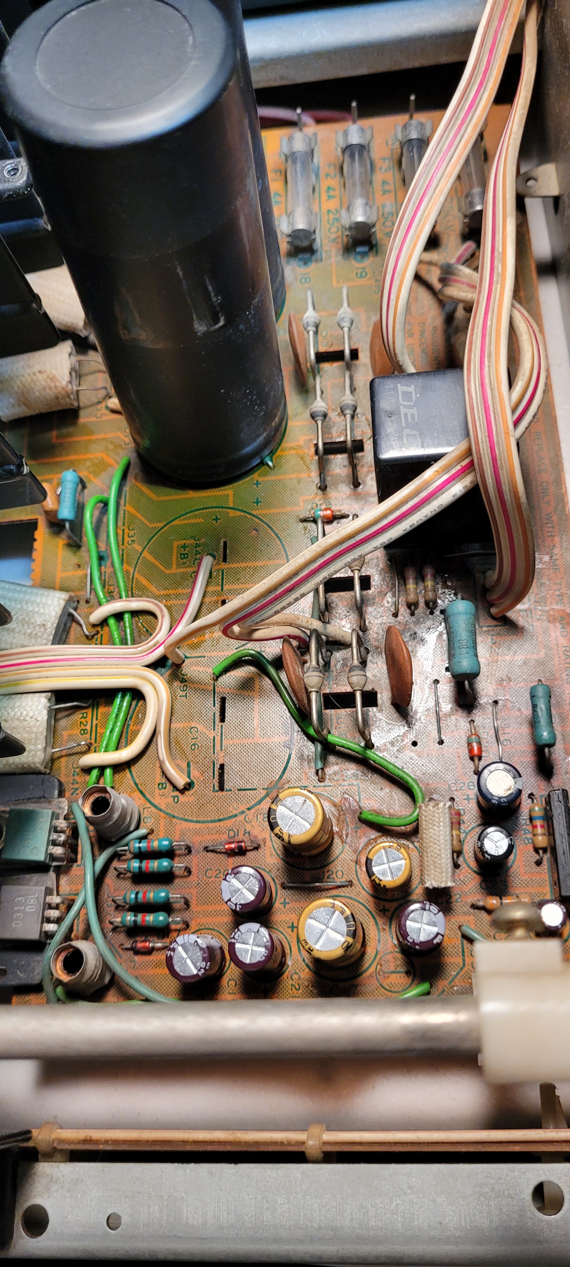 by DrDosI have finished my work. The new lights come on except the one for stereo, I reversed the bulbs to no affect, anyway, the unit powers on, relay clicks. I have no DC voltage in speaker outputs, I also do not have any AC in the speaker outputs. There is some faint crackling in the speaker. This unit cranks up loud so I had the volume on very low. Everything seems to be fine but I can't really check the switch until I can get sound out of the outputs. I was going to do caps for the power supplys and the tone board but thought if it was cranking loud at one time maybe just leave it alone until it...1 Photo