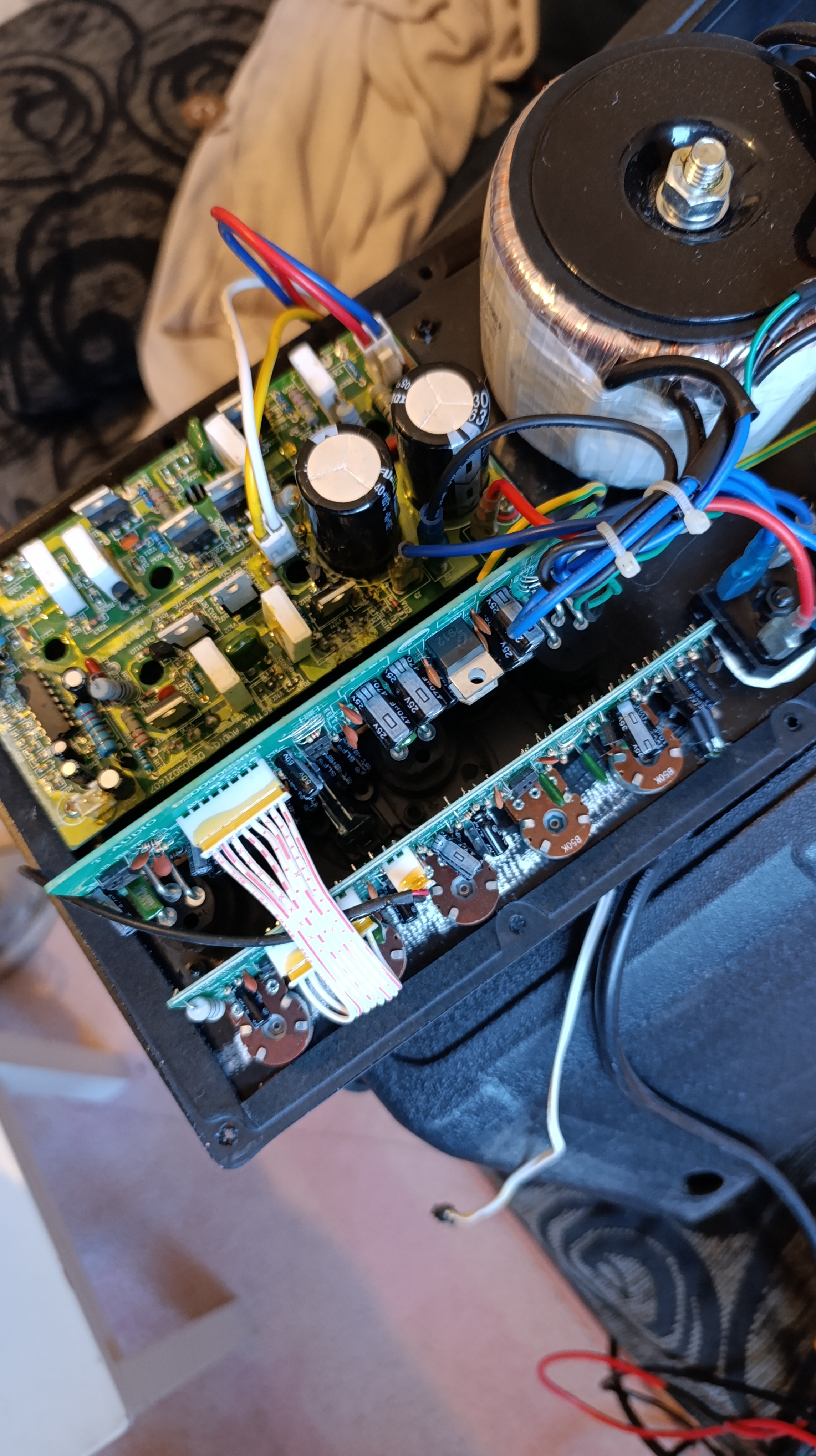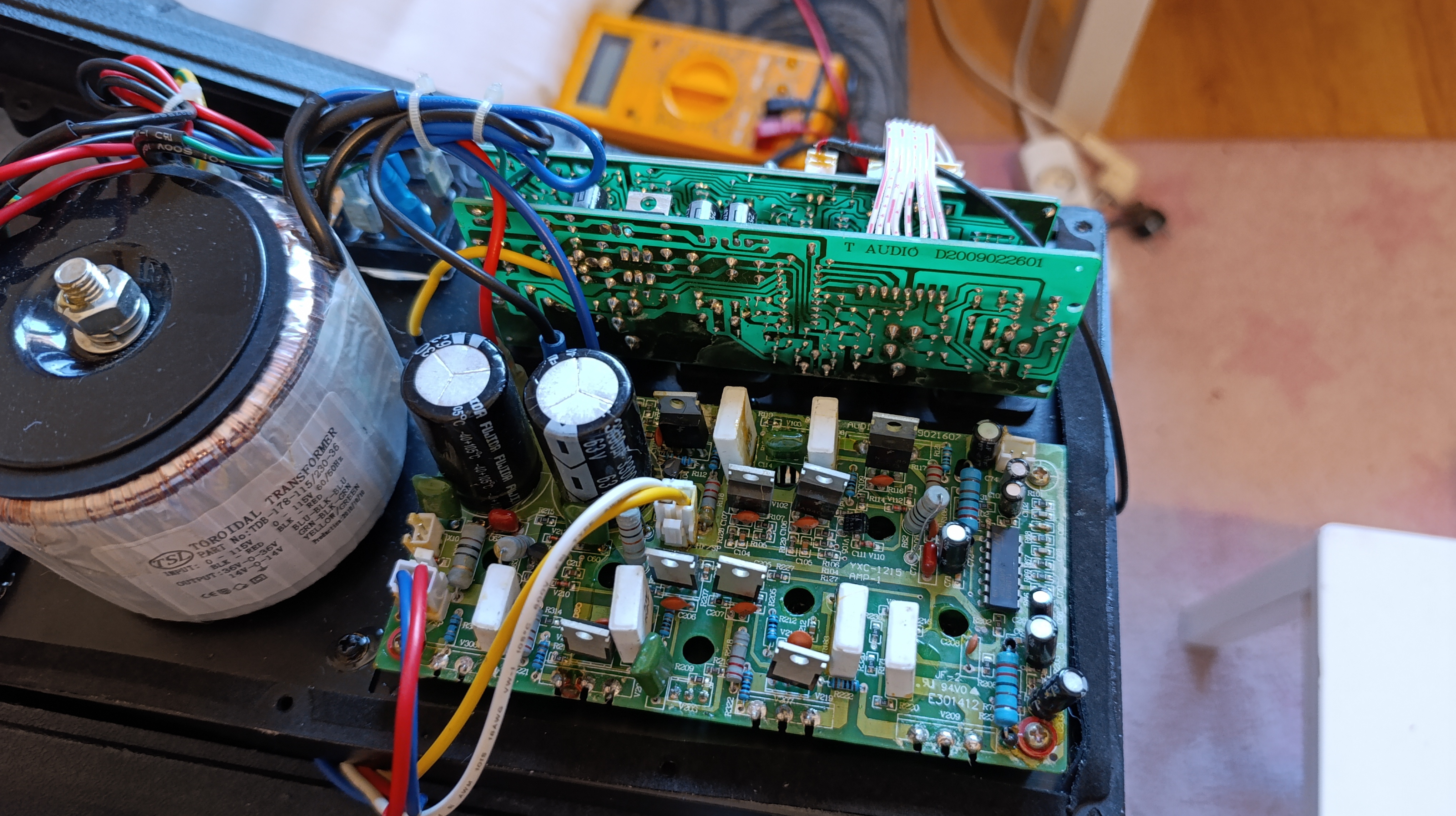 There's also a large toroid transformer that feeds a lower voltage to the first 2 boards and a larger voltaje (36x2 rectified close to 100v) to the power board. The power board has the plugs for both speakers