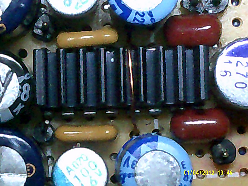 Input voltage: ~12v +/- 5% Output resist: 2ohm (2x 4ohm) CAPName Series Temp C/V Location ------------------------------------------------------ Evercon ME 105c 1500uf/ 6.3v Output Decouple Pana/OSCon SEPC 105c 270uf/16.0v SVR Rubycon CE-W 85c 220uf/ 6.3v Feedback Rubycon PK 85c 680uf/16.0v Supply UCC(?) A07C? 105c? 100uf/16.0v Bootstrap ?MLCC X7R ??? 0.47uf/50.0v Freq.Stability ?Polyester ?? ??? 0.22uf/??.?v DC Decouple Miscellaneous ------------------------------------------------------ ST TEA2025B Class-AB W990D0001 Malaysia Vishay Resistor-1/8w MetalFilm 1%/50ppm/562ohm Ratshack PCB 276-168B GeneralPurpose