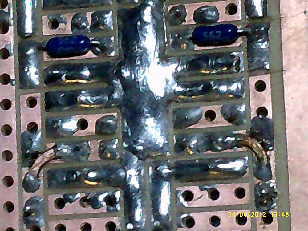 The amp will be getting a wakefield 650-B aluminum heatsink attached soon once it arrives. I have a wire clamp point allocated for it between two of the jointed solder grounds. The excess traces behind the inputs and ground lines are used for heatsinking purposes as well and have been augmented with flattened 24 gauge solid core wire and the centre with flattened desoldering braid in the very center.