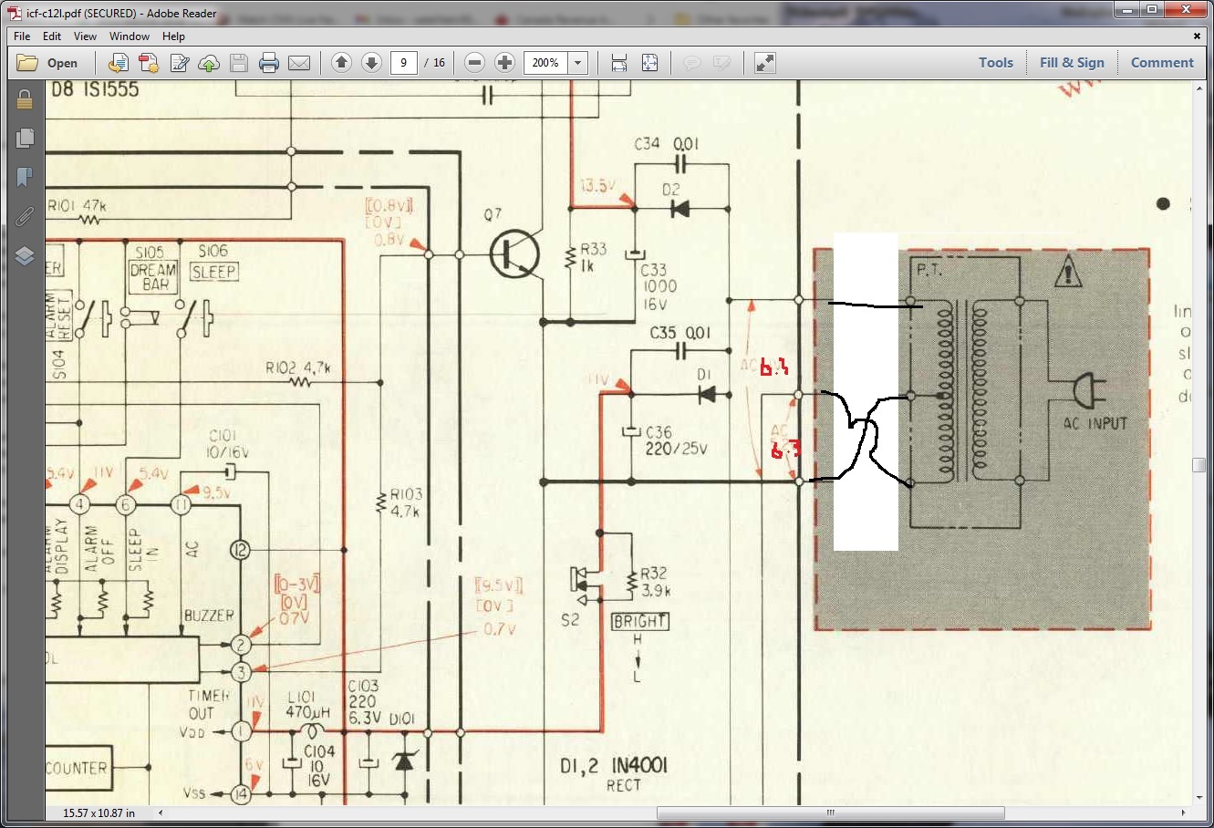 I get the same reading on the main board when I connect the probes the way R_J suggested: black on C36 negative and red on PT pin 1 in AC mode.