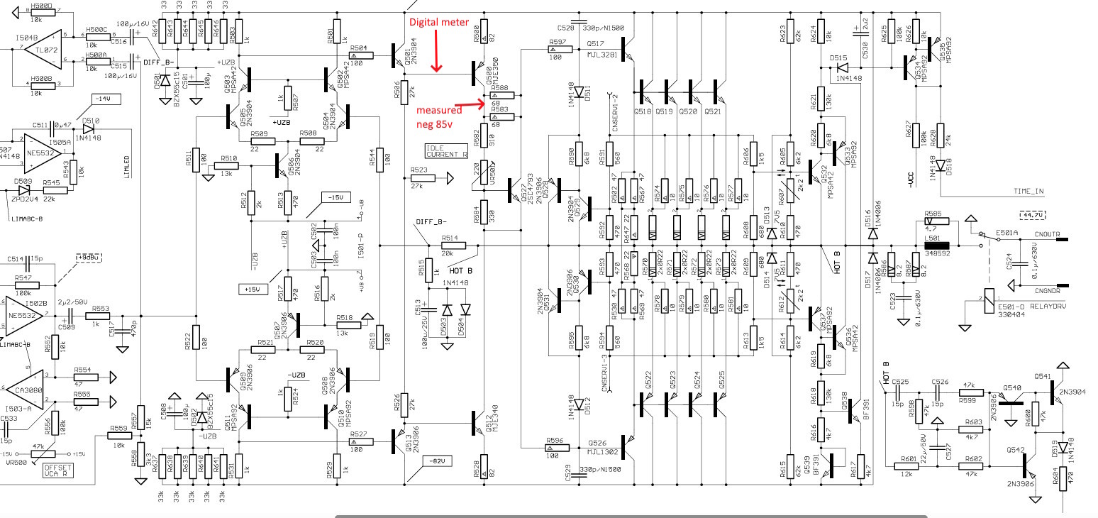 The protection light is perminently on. The right sode has a -80DC on the feed to the speaker, hence the protection led on. I have removed all the O/P transistors which checked out OK. I tested all other transistors in circuit which seem ok also. I did find D512 short but having replaced it and checked all its associated transistors I still have the problem.