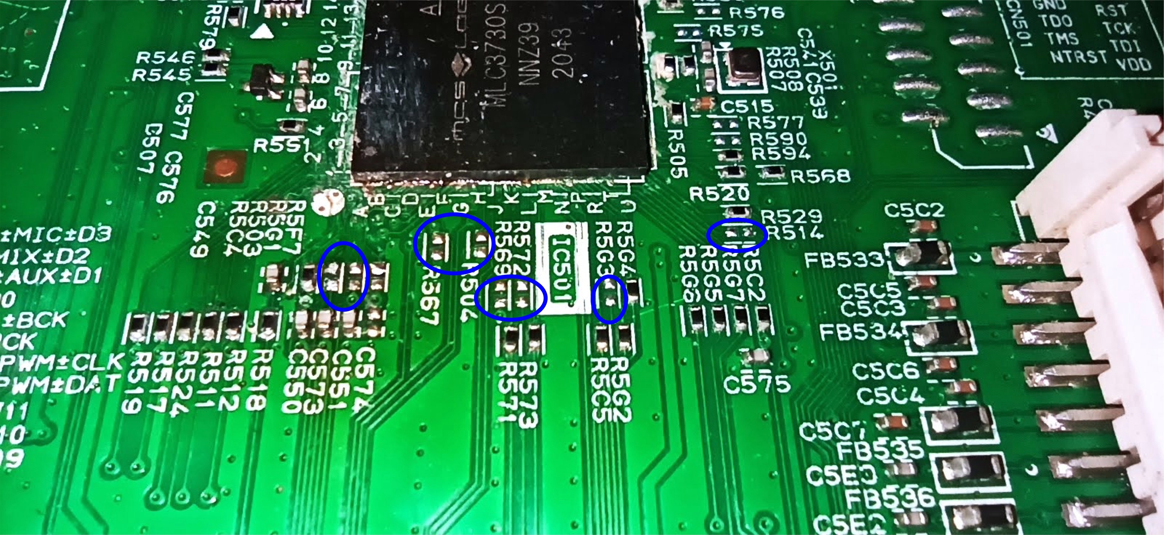 For instance R5F7 R5G1 R503 seem to be connected to the caps next to them. Most likely those correspond to R5N9 R529 R528 on LG LAP250H.