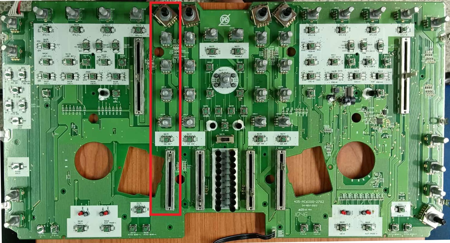 I need your help with a non-functioning channel on this Denon controller. I noticed the problem because, with the mixing software, the channel appears completely off and none of its controls work. At the top of the channel, like the others, there's a selector switch that moves between MIDI and external audio inputs. I also tried connecting an audio source (since it's also a standalone mixer) and I got no input. The flat cable connecting this panel to the sound card is fine. I'm attaching a photo and the service manual. I hope someone can help me resolve the issue. Thanks.