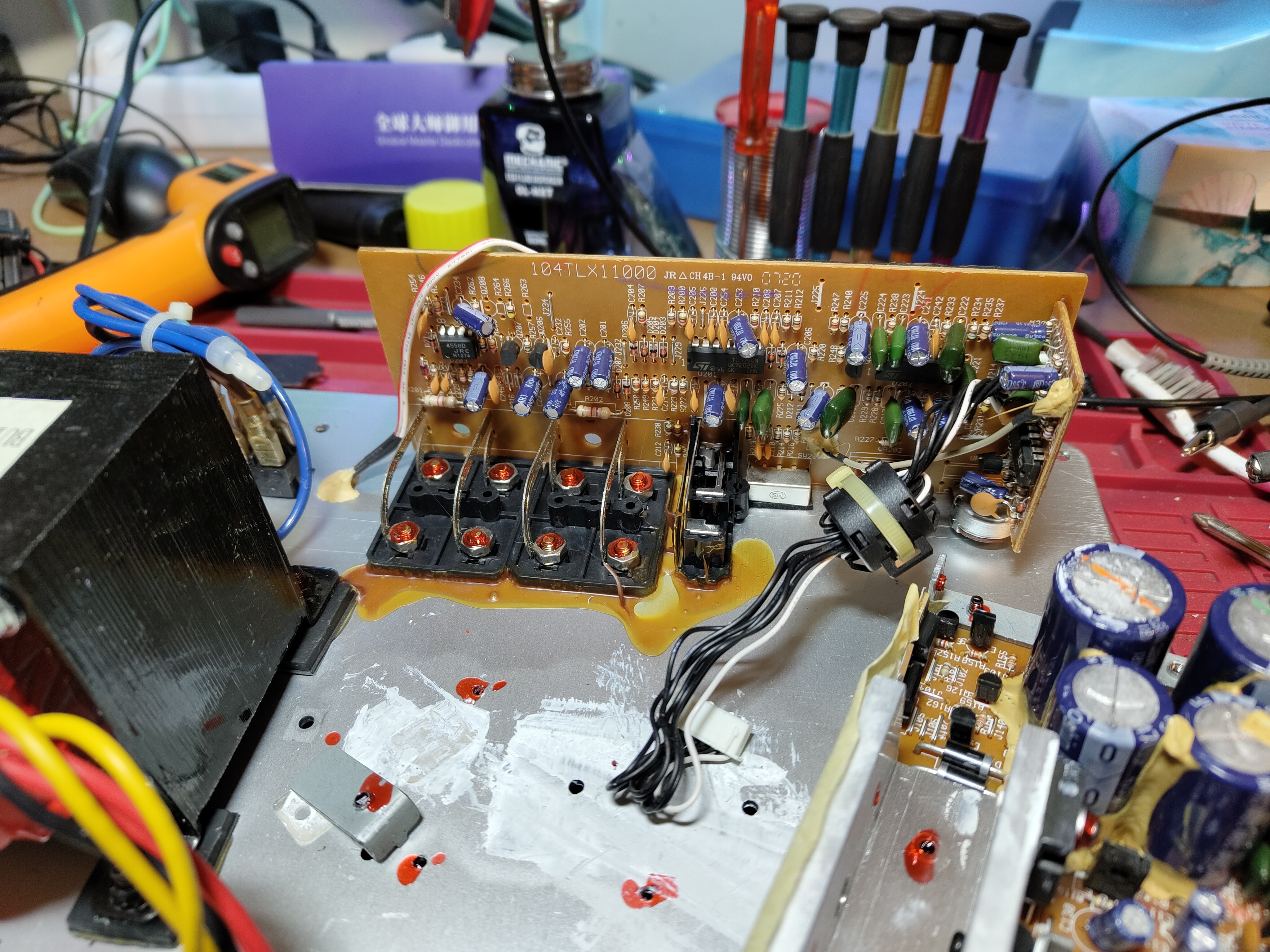 The transistors on the amplifier are rapidly heating up after power on and the speaker produces a wobbly humming noise. I can also measure a lot of weird things on the board.