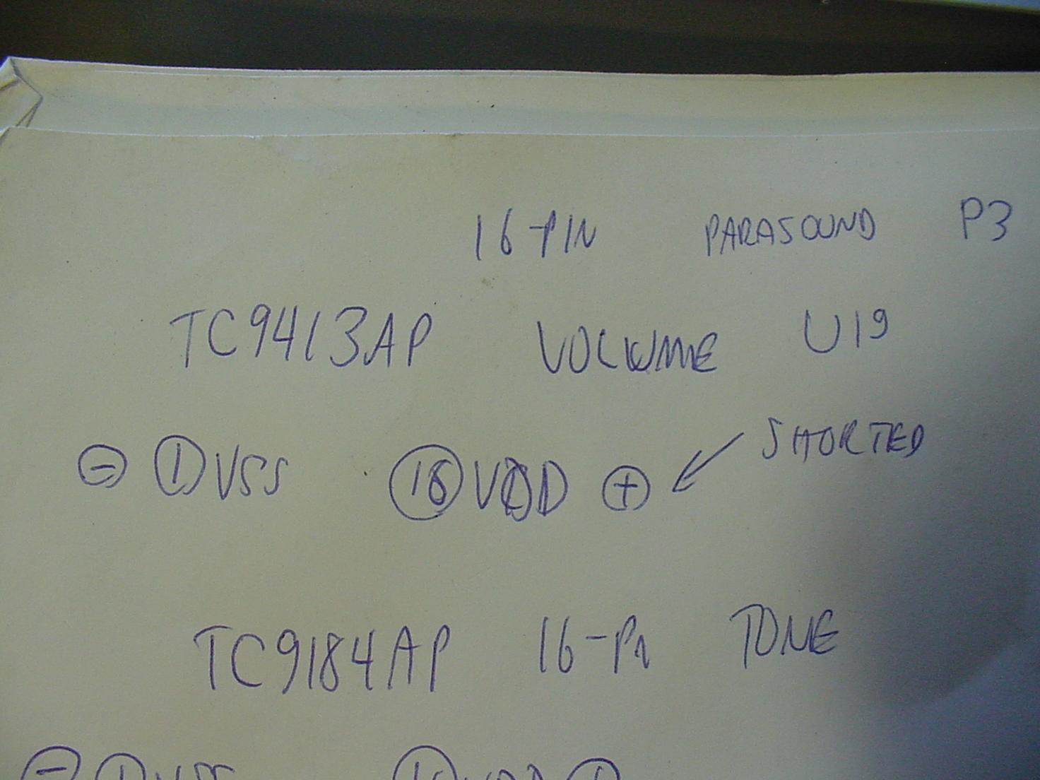 Soldered it and the voltages are reading fine now but the distorted sound is still present, I did more research on the non-opamp IC (there are two 16-pin ICs, one is for Volume control, and another one is for Tone control) so I can get the pin out for the voltages feeding the ICs, I was suspecting the Volume control IC since turning the Volume control knobs has no effect on the level of the distorted sound. The -VCC is showing -12V, but the +VCC is showing <1V, check the resistance reading on the +VCC and it shows < 5 Ohms. The +/-VCC pins are fed through 100 Ohms resistors and small lytics cap for filtering. Removed the filter caps and it still shows <5 Ohms, so I cut the +VCC pin then the 5 Ohms reading went away. check the +VCC pin and GND pin of the IC off the board and it shows <5 Ohms. Luckily I still some of these Toshiba ICs in stock, now it is running, it sounds pretty good.