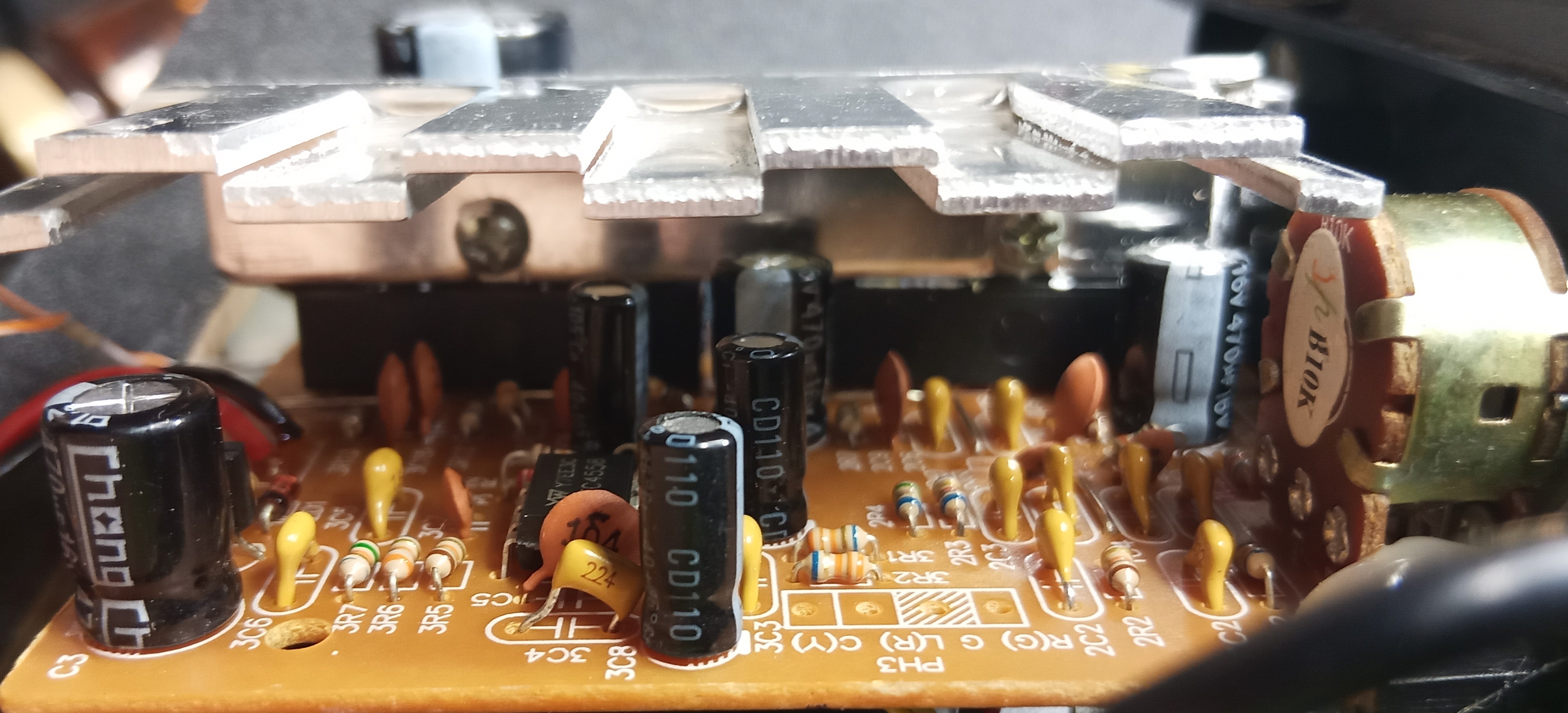 The PCB is quite simple. There is a UTC4558 amp and two D6282 audio amps. When I put my finger on the UTC4558 I can see and hear the speaker "fart". Although, the left side of it (pins 5-8) make louder noise than the right side (pins 1-4) When I go over the D6282 labled 2 with my finger, I can make the speaker fart, albeit quite a bit fainter. When I go over the D6282 labled 1 with my finger, I cannot make the speaker fart (or the noise is so faint that you can barely hear it).