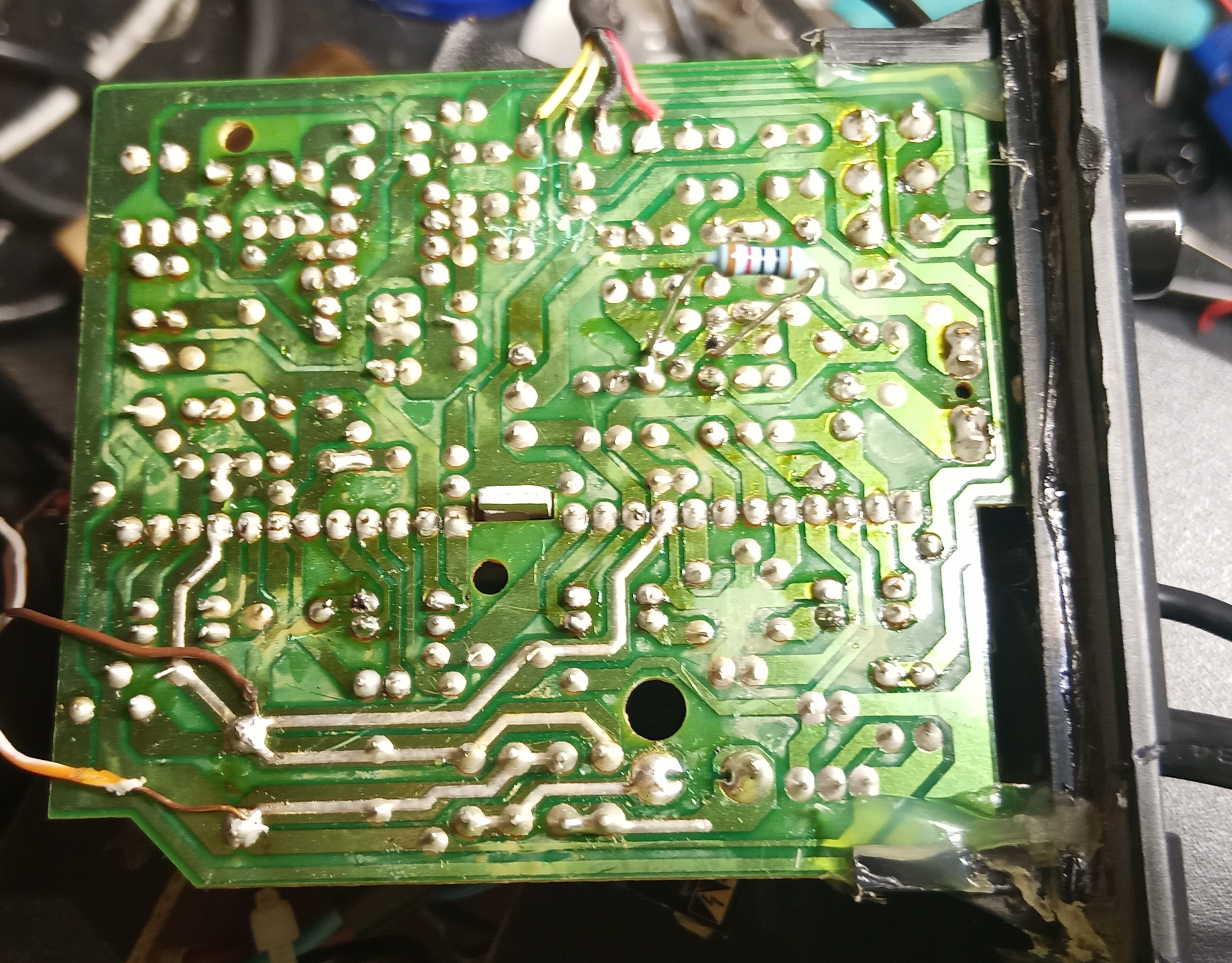 I'm thinking this is either a dead audio amp or bad caps, but since this is my first time with fixing audio appliances, I'd like to ask for guidance. After I opened it for the first time I noticed the bass potentiometer had been reflowed before me. Everything else looked factory.