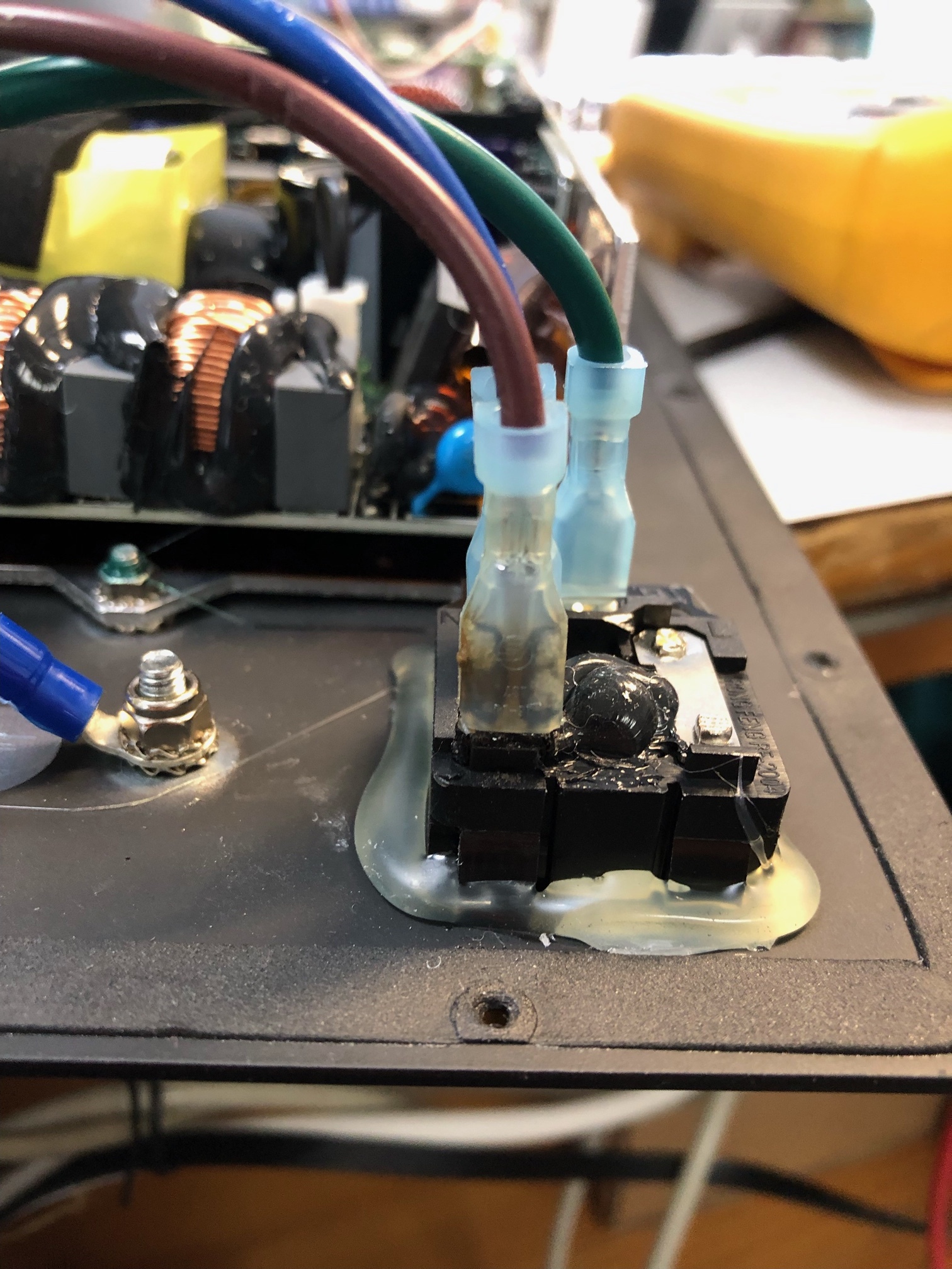 Note the black epoxy inside the power tab insulation (Brown cable)