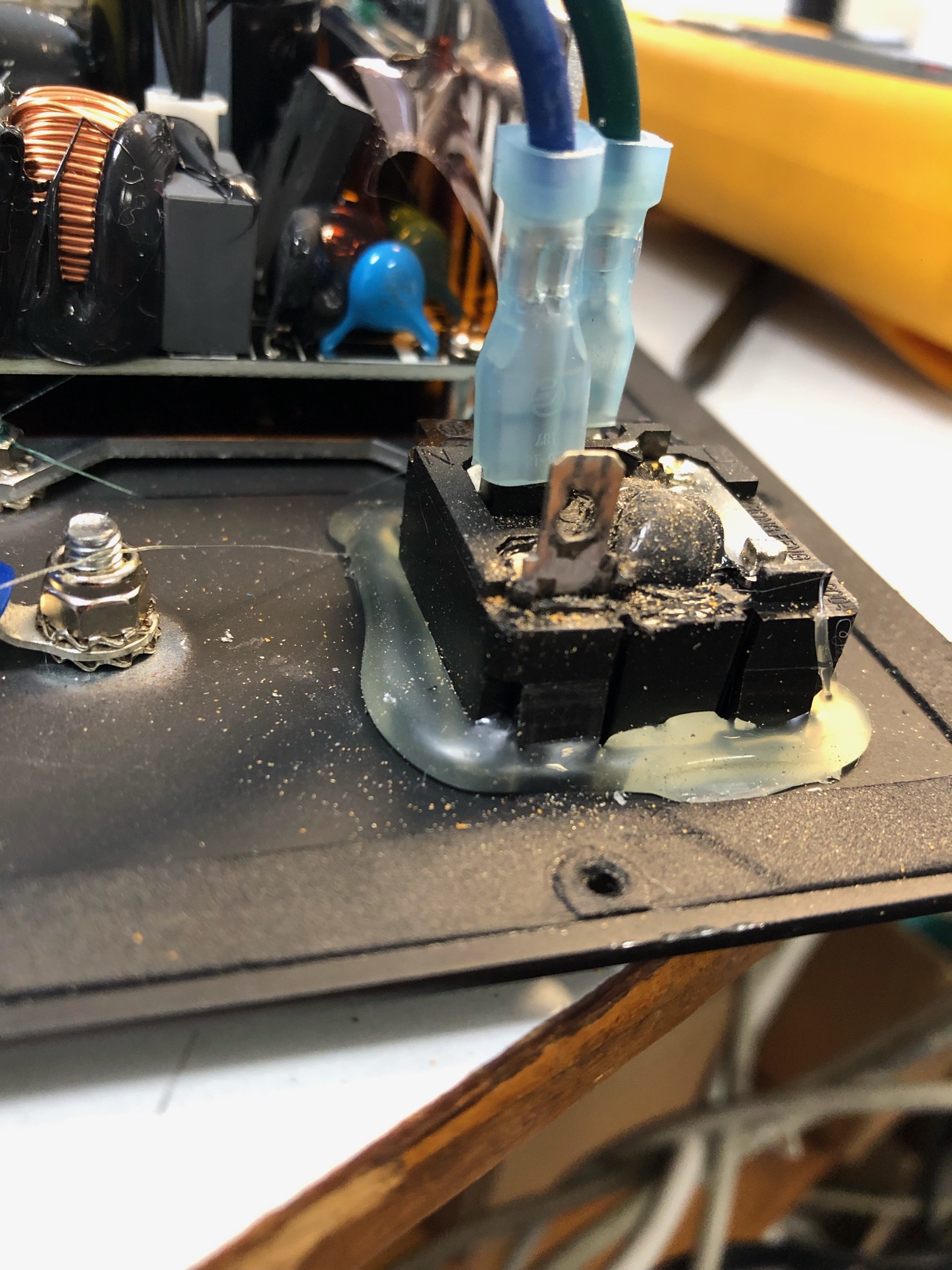 Upon closer inspection, found that there is some factory applied black epoxy to secure the tabs in place? With some elbow grease and a pair pliers, removed the contacts on the AC socket for a closer inspection. The black epoxy effectively created an insulation barrier for the power path. Removed the dried up epoxy and sanded the contacts clean. Compressed the contacts a bit more for an improved friction fit. Reseated and rebuilt the unit and working like new. Plan B was to toss the unit due to the weight and gobs of black epoxy on the power supply and amp regions. Not practical to service the unit.