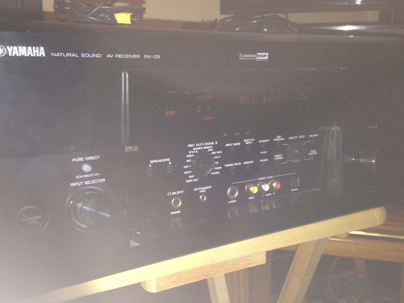 I just came into a used Yammy RX-Z9 A/V receiver. The front display shows 'Mic In' even though there is no microphone plugged into the front jack. This is preventing me from getting any sound out of the unit except for analog "pure direct" mode. There doesn't appear to be anything jammed into the mic port and I have tried inserting and removing (and twisting and wriggling) the calibration mic plug. I even tried a q-tip with a bit of alcohol to no avail.