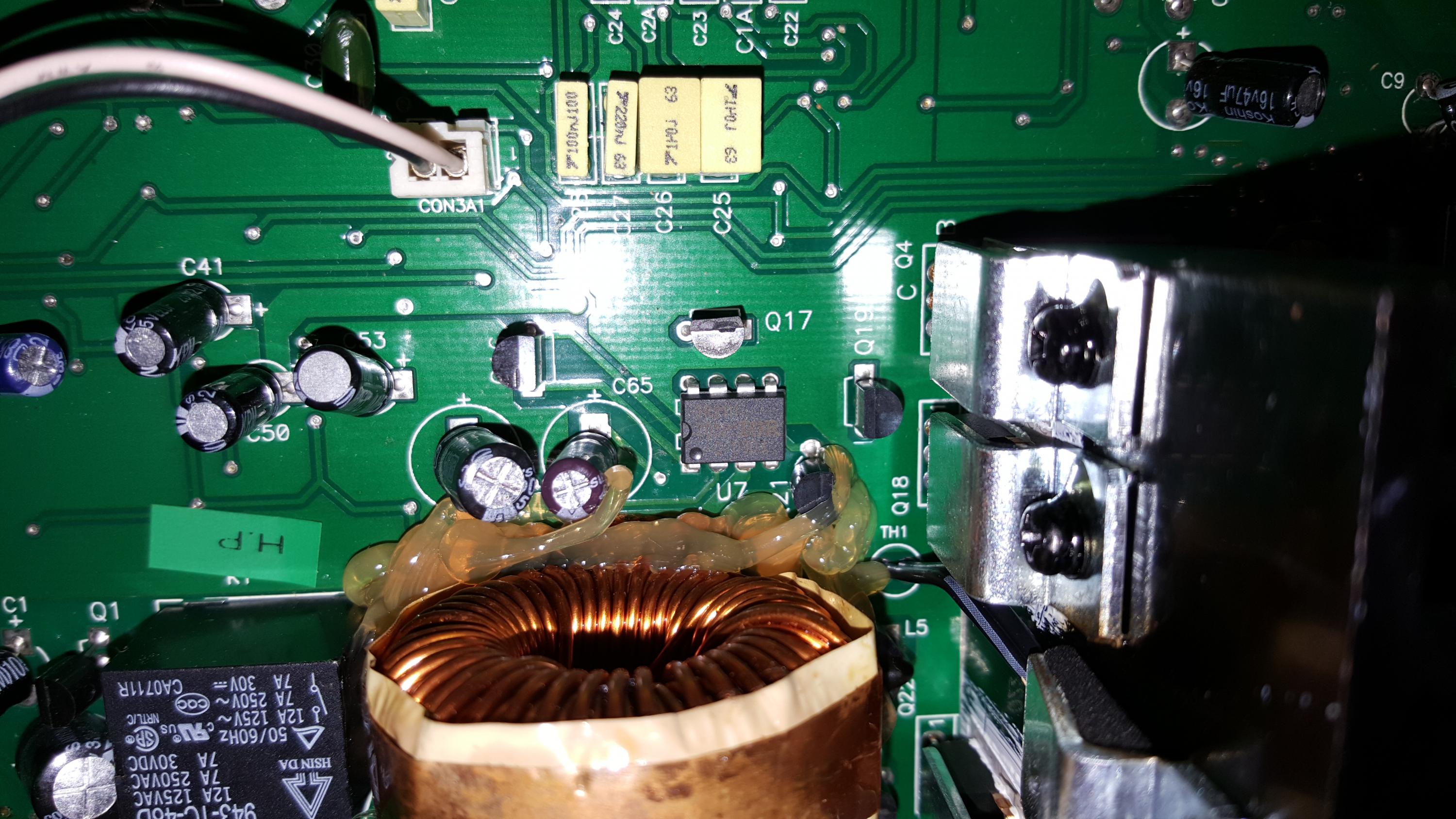 I've attached a few pictures. 1 pic is an overall view of the board (it's missing the one capacitor I removed). And there are 2 pics that show a copper coil with some gel-like substance. This gel looks like it's spread out and covered some of the components and went under others. Not sure what the gel is, but is that okay?