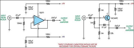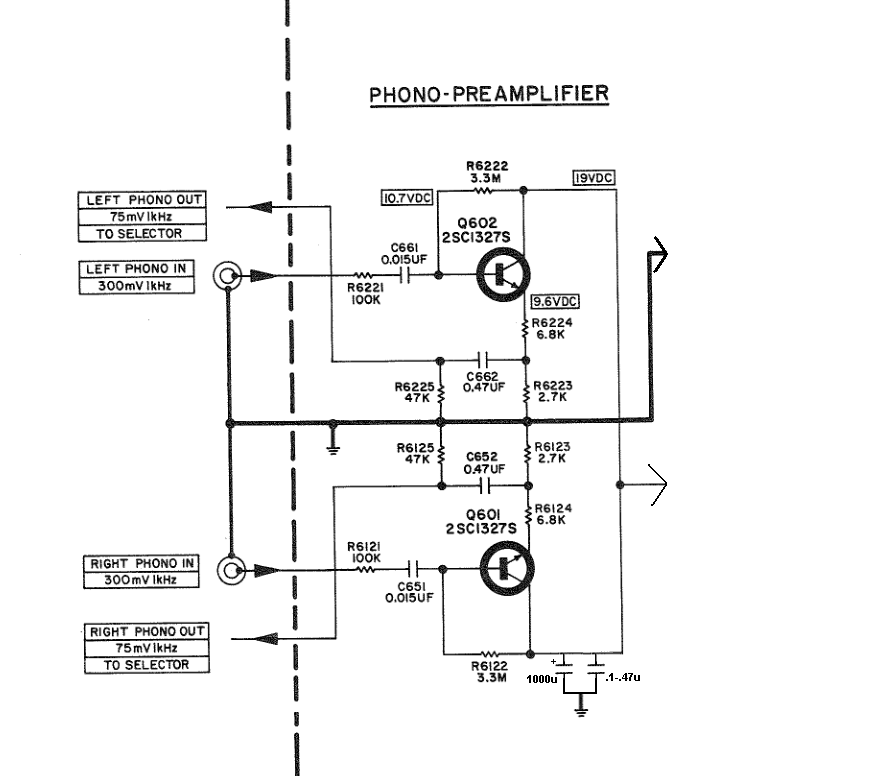Even the typical circuit from the 70's will do. I've attached part of the schematic from a Sanyo/Fisher 4080. Notice I've added two caps and lines to an external power supply for "stand-alone" use." Use modern devices for the transistors- KSC/2SC1815, KSC945, or even 2SC2240. The 3.3M bias resistors may need to be changed to suit substitute transistors- you want approx 1/2 B+ from the emitters to GND. If the output level is too low, connect the 0.47u coupling caps directly to the emitters instead of the junction of the 6.8K and 2.7K resistors. This will increase the output level to 275mV.